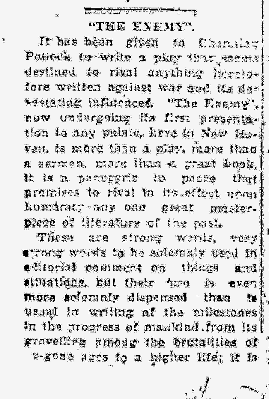 It has been given to Channing Pollock to write a play that seems destined to rival anything heretofore written against war and its devastating influences. "The Enemy," now undergoing its first presentation to any public, here in New Haven, is more than a play, more than a sermon, more than a great book, it is a panegyric to peace that promises to rival in its effect upon humanity any one great masterpiece of literature of the past.