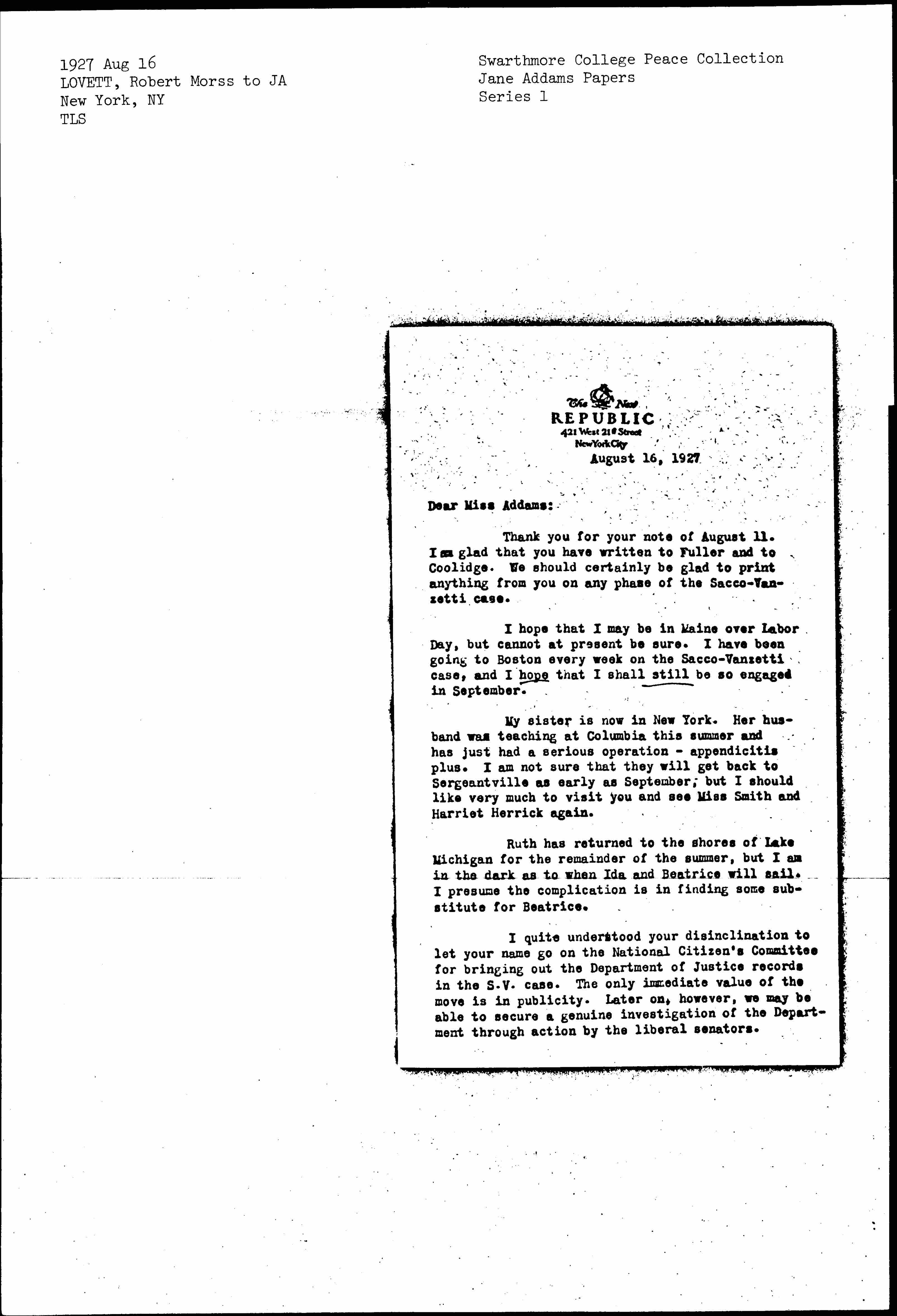 I hope that I may be in Maine over Labor Day, but cannot at present be sure. I have been going to Boston every week on the Sacco-Vanzetti case, and I hope that I shall still be so engaged in September.