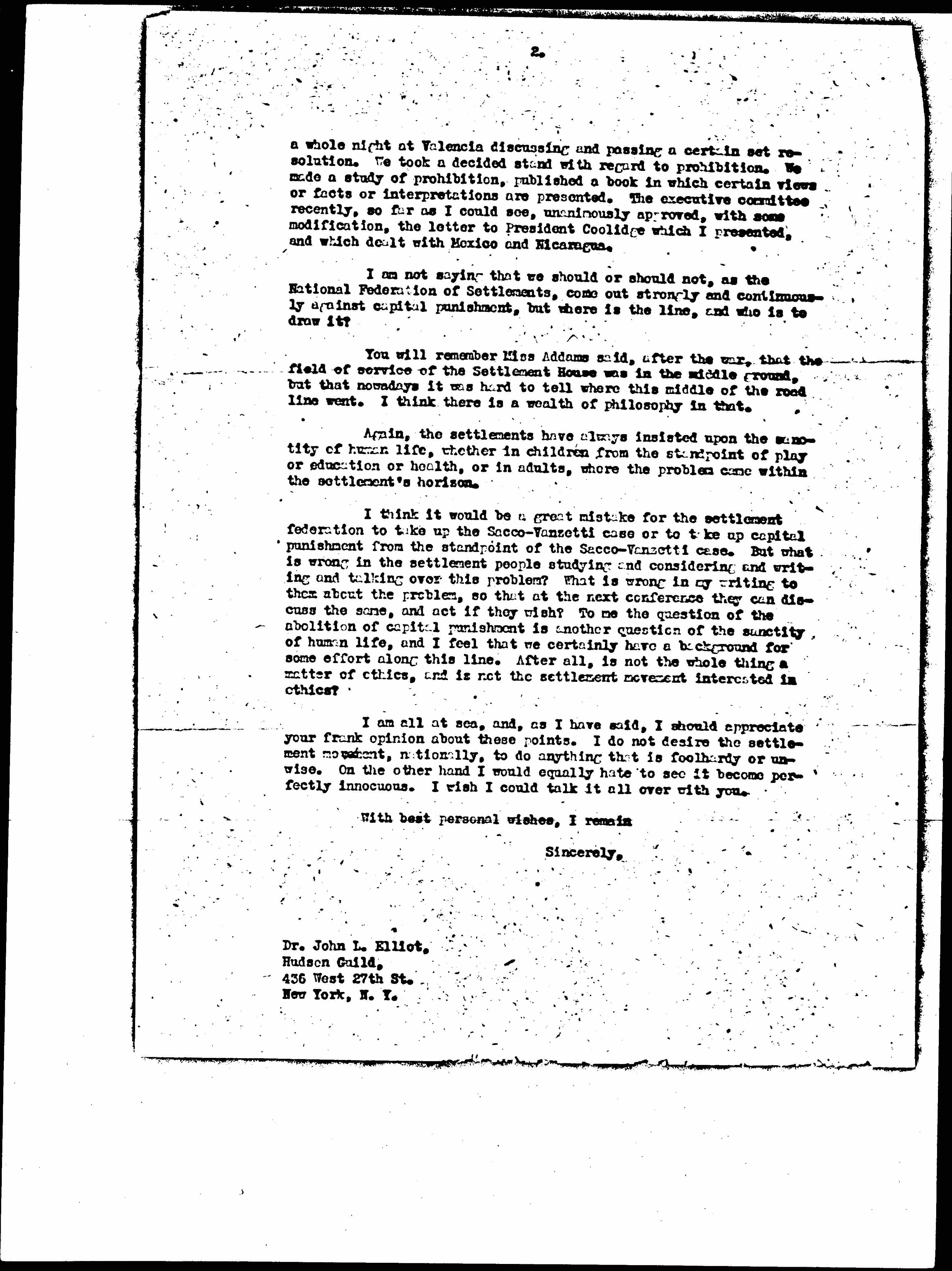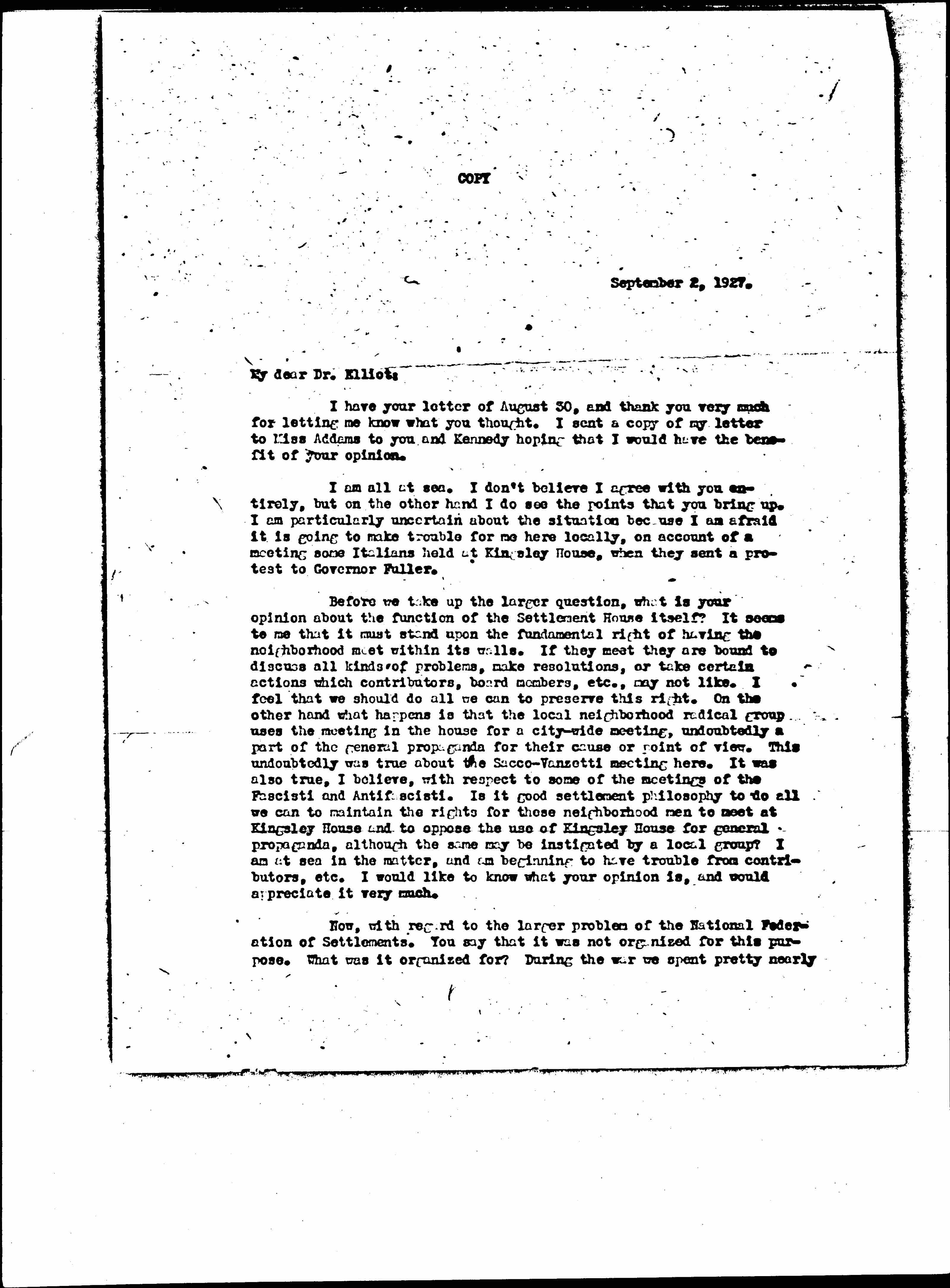 John Lovejoy Elliott to Jane Addams, August 29, 1927