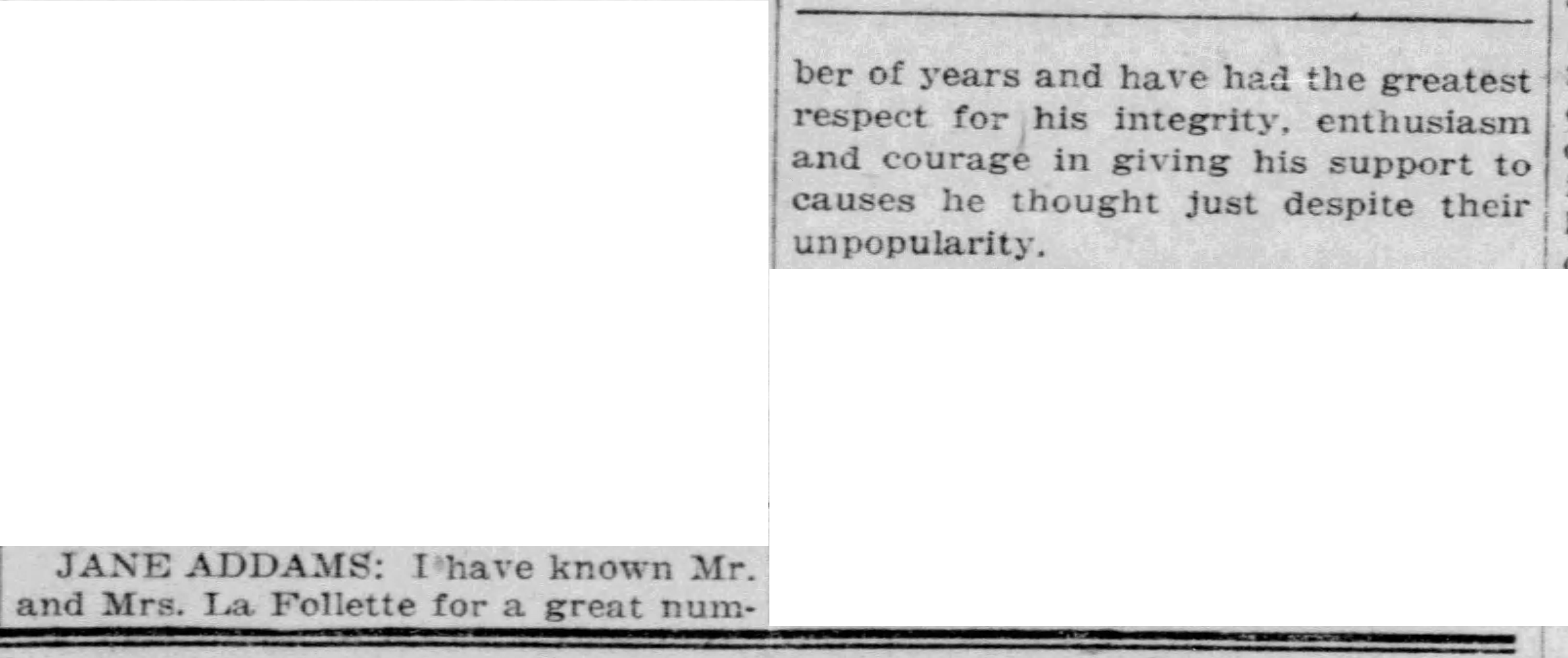 JANE ADDAMS: I have known Mr. and Mrs. La Follette for a great number of years and have had the greatest respect for his integrity, enthusiasm and courage in giving his support to causes he thought just despite their unpopularity.