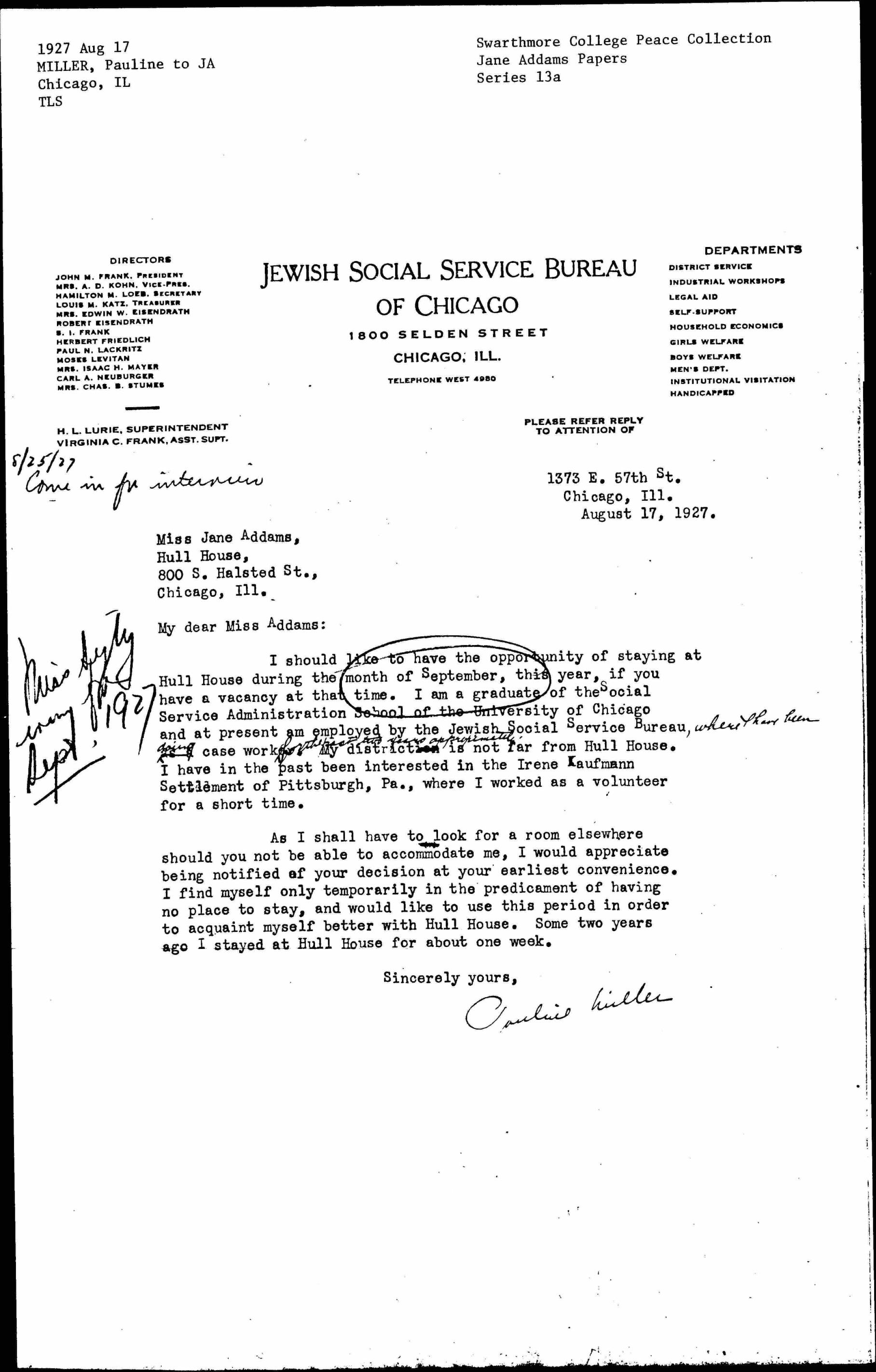 I should like to have the opportunity of staying at Hull House during the month of September, this year, if you have a vacancy at that time. I am a graduate of the Social Service Administration School of the University of Chicago and at present am employed by the Jewish Social Service Bureau as ↑, where I have been doing↓ case work ↑for the past two years approximately.↓ My district is not far from Hull House. I have in the past been interested in the Irene Kaufmann Settlement of Pittsburgh, Pa., where I worked as a volunteer for a short time.