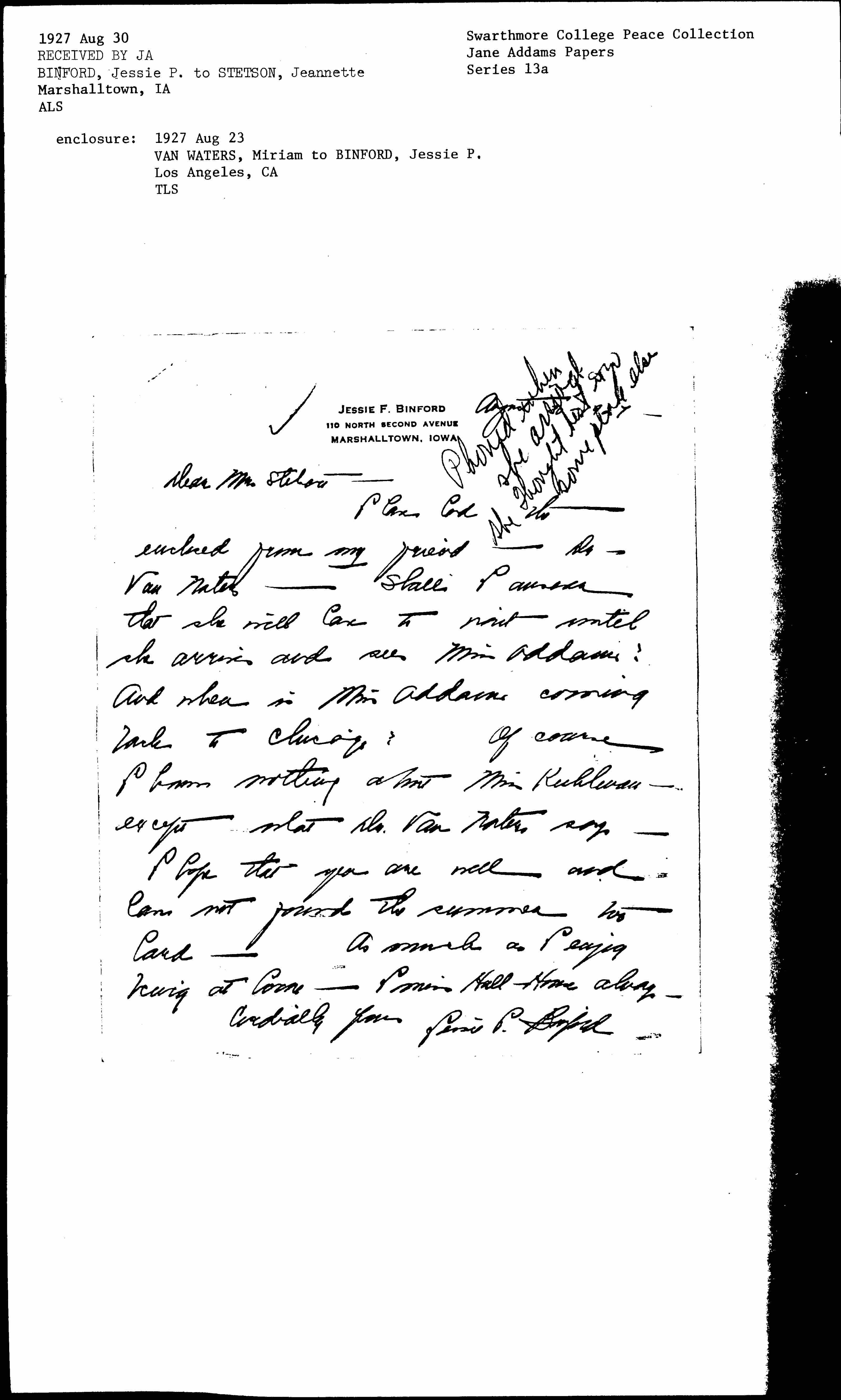 Jessie Florence Binford to Jeannette Stetson, August 30, 1927