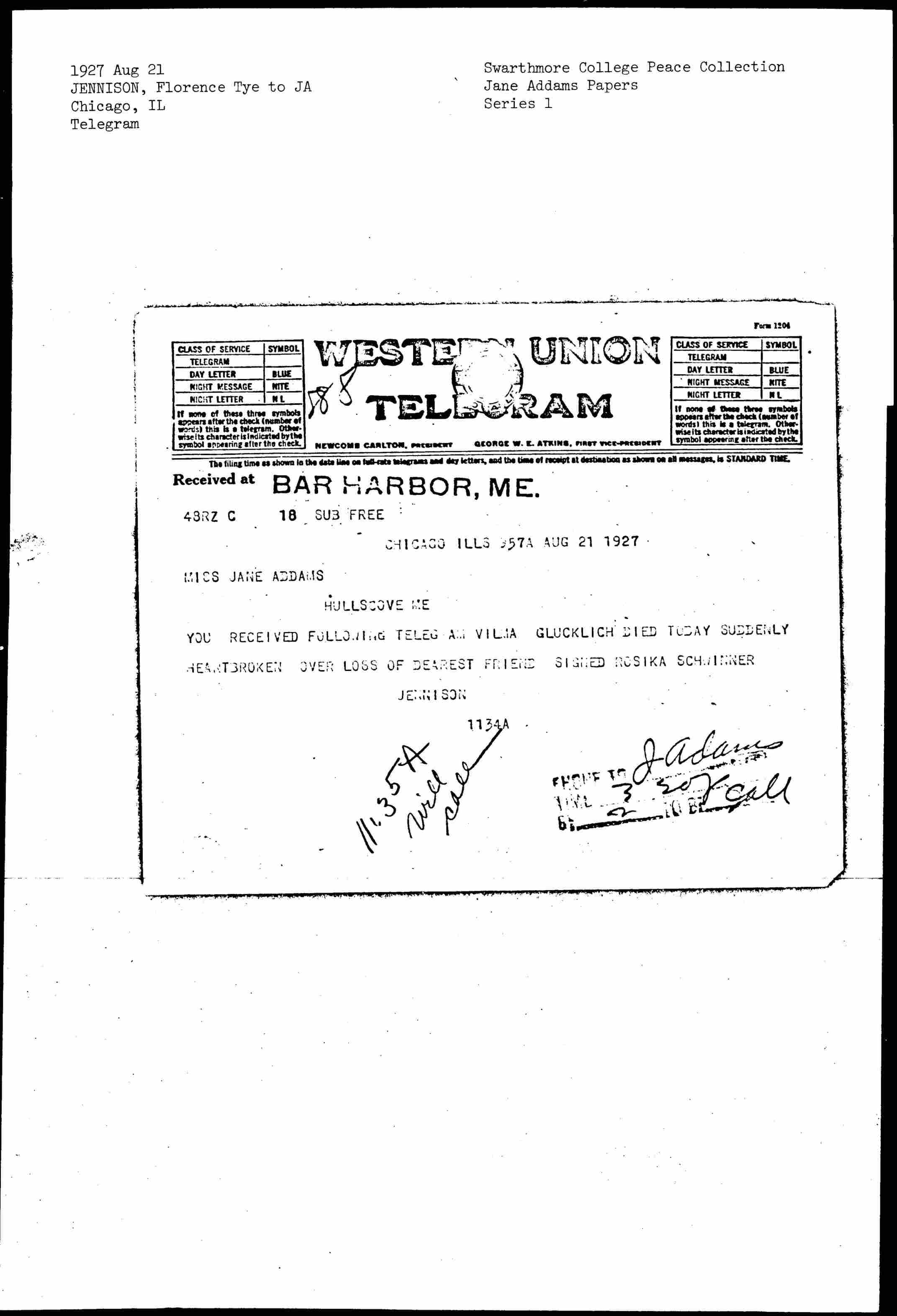YOU RECEIVED FOLLOWING TELEGRAM VILMA GLÜCKLICH DIED TODAY SUDDENLY HEARTBROKEN OVER LOSS OF DEAREST FRIEND SIGNED ROSIKA [SCHWIMMER]