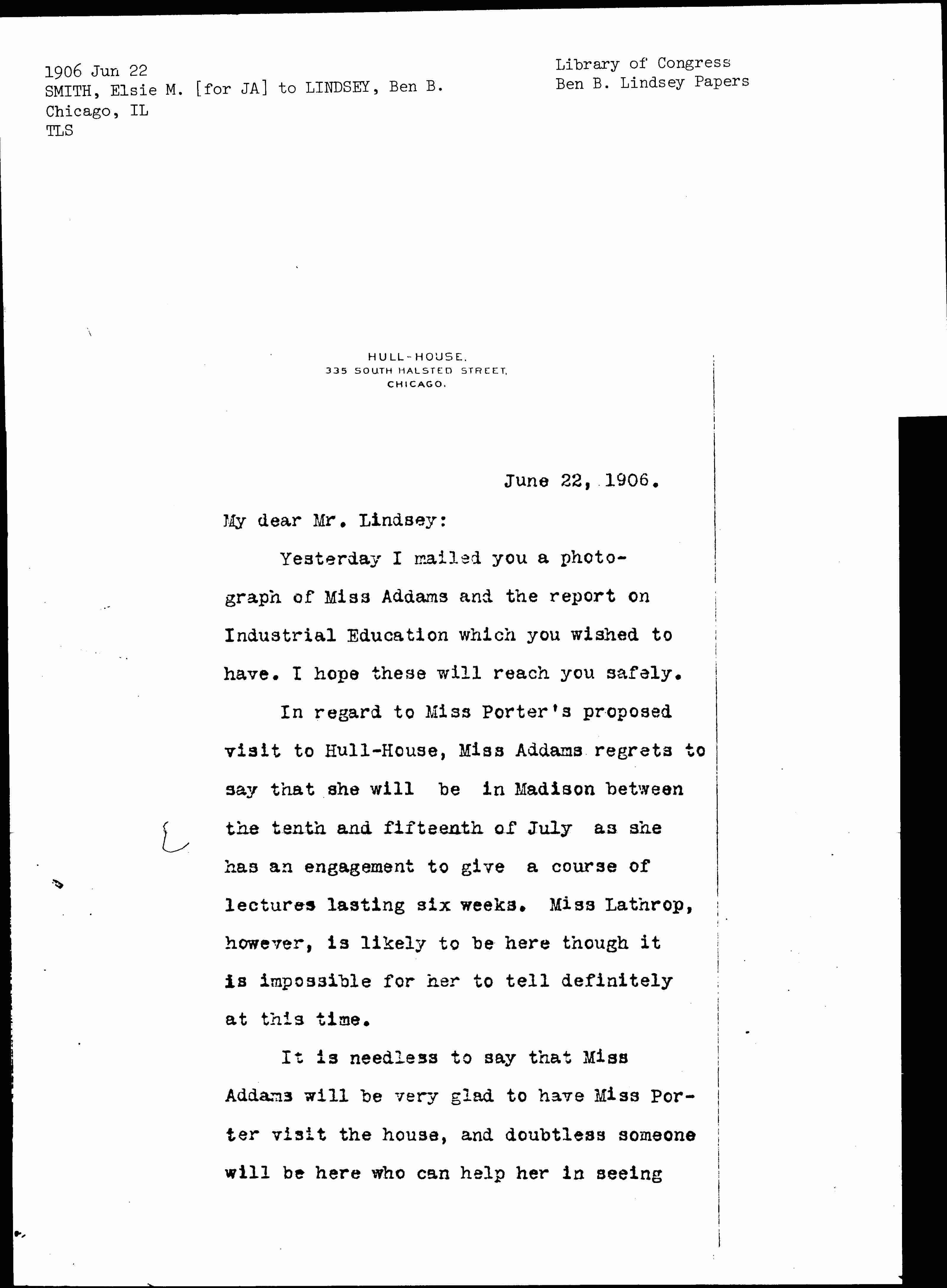 In regard to Miss Porter's proposed visit to Hull-House, Miss Addams regrets to say that she will be in Madison between the tenth and fifteenth of July as she has an engagement to give a course of lectures lasting six weeks. Miss Lathrop, however, is likely to be here though it is impossible for her to tell definitely at this time.