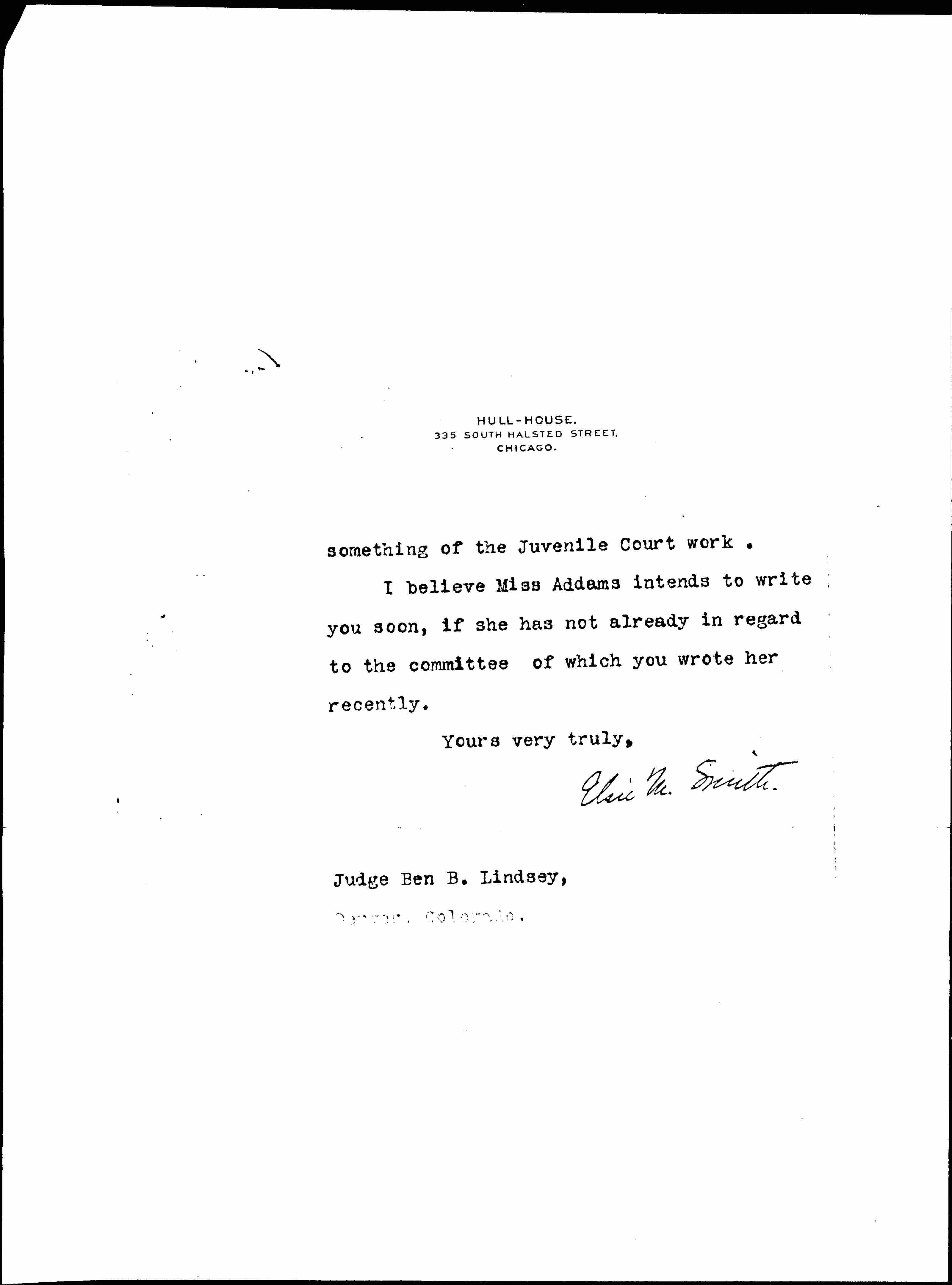 I believe Miss Addams intends to write you soon, if she has not already in regard to the committee of which you wrote her recently.
