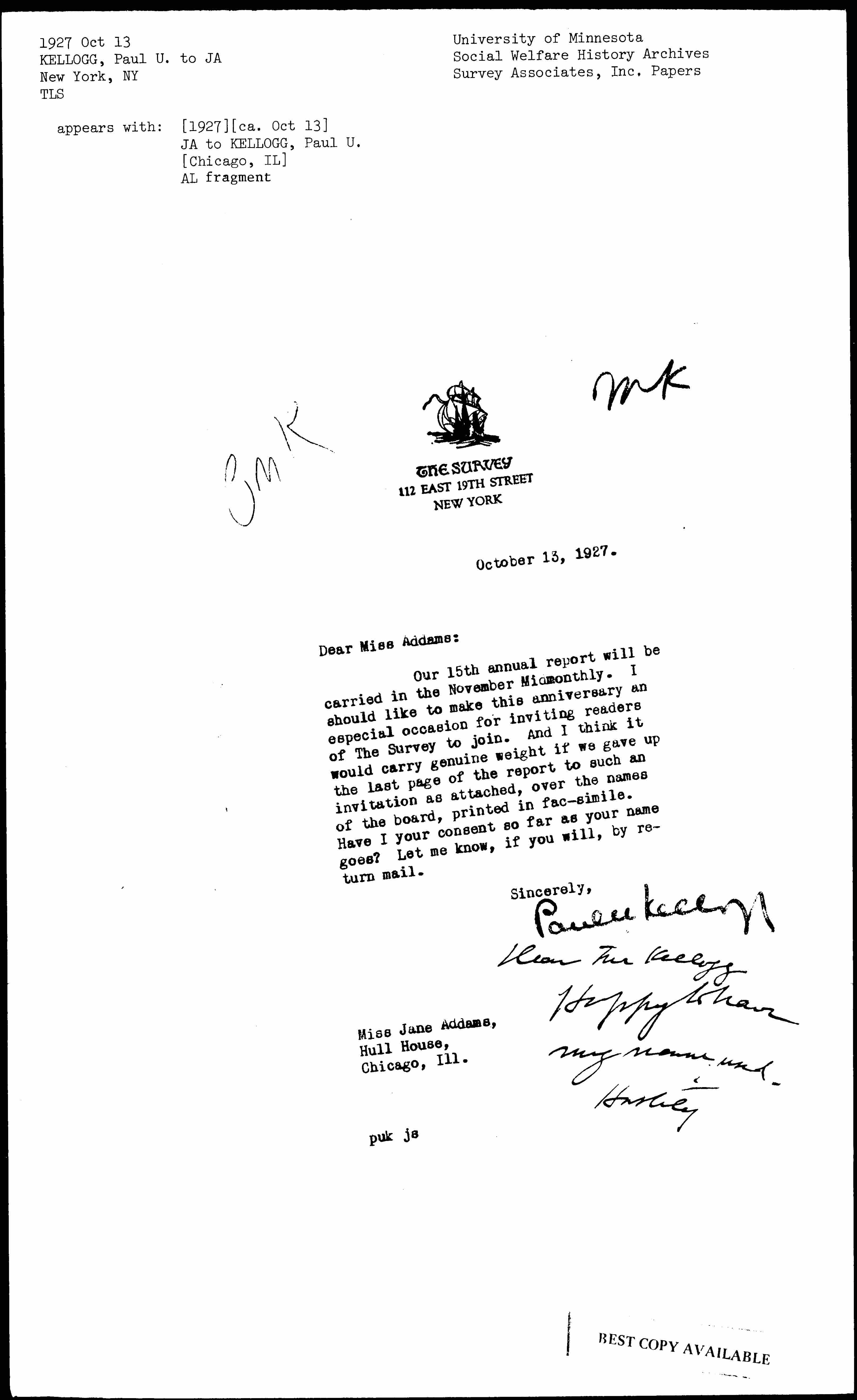 Paul Underwood Kellogg to Jane Addams, October 13, 1927