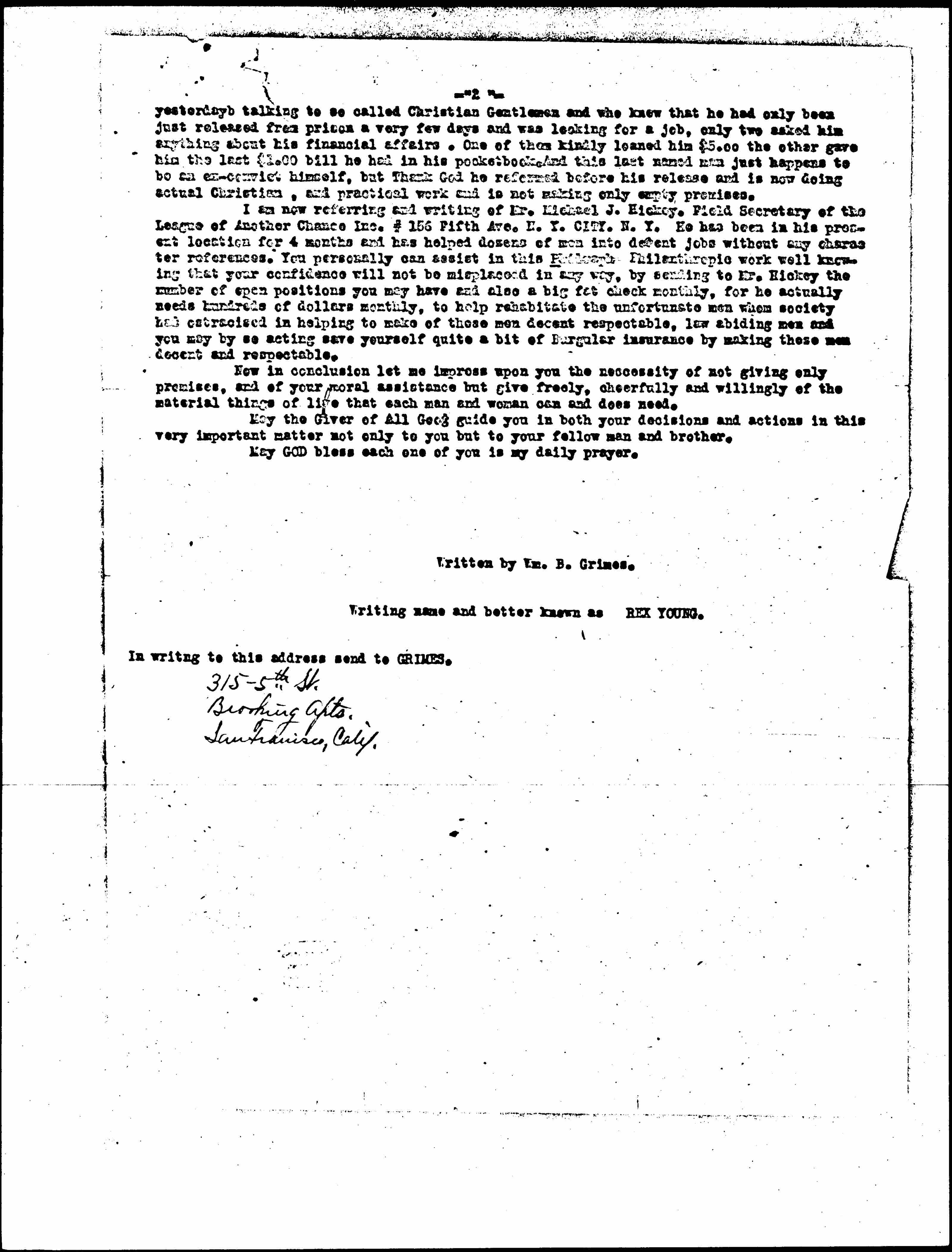 I shall now tell you two personal experiences that happened to the writer only yesterday. A boy of 19 years who had been in a reformatory for a period of time put there by an inhuman Step Father, had actually went to work on some of the large Steamship Docks handling the heaviest kind of freight, without anything to eat at all. At noon time he asked for and received $.50 for his dinner, but owing to the fact that he was so hungry and weak the overloading of his stomach made the unfortunate Lad sick and he could not return to his job. The writer although a grown man of 46 years of age was in many offices yesterday talking to so called Christian Gentlemen and who knew that he had only been just released from prison a very few days and was looking for a job, only two asked him anything about his financial affairs. One of them kindly loaned him $5.00 the other gave him the last $1.00 bill he had in his pocketbook. And this last named man just happens to be an ex-convict himself, but Thank God he reformed before his release and is now doing actual Christian, and practical work and is not asking only empty promises.