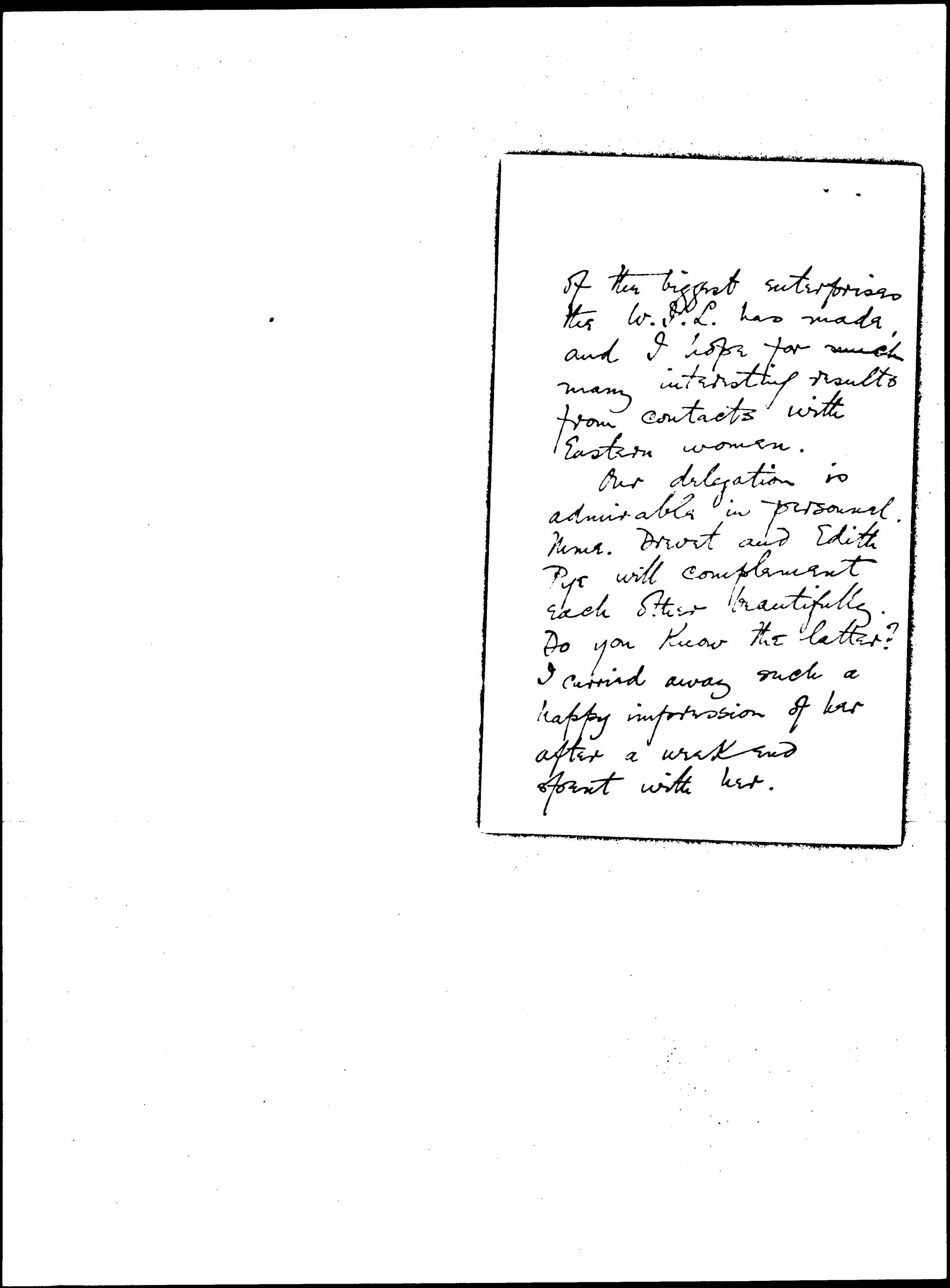 Our delegation is admirable in personnel. Mme. Drevet and Edith Pye will complement each other beautifully. Do you know the latter? I carried away such a happy impression of her after a weekend spent with her. [page 3]