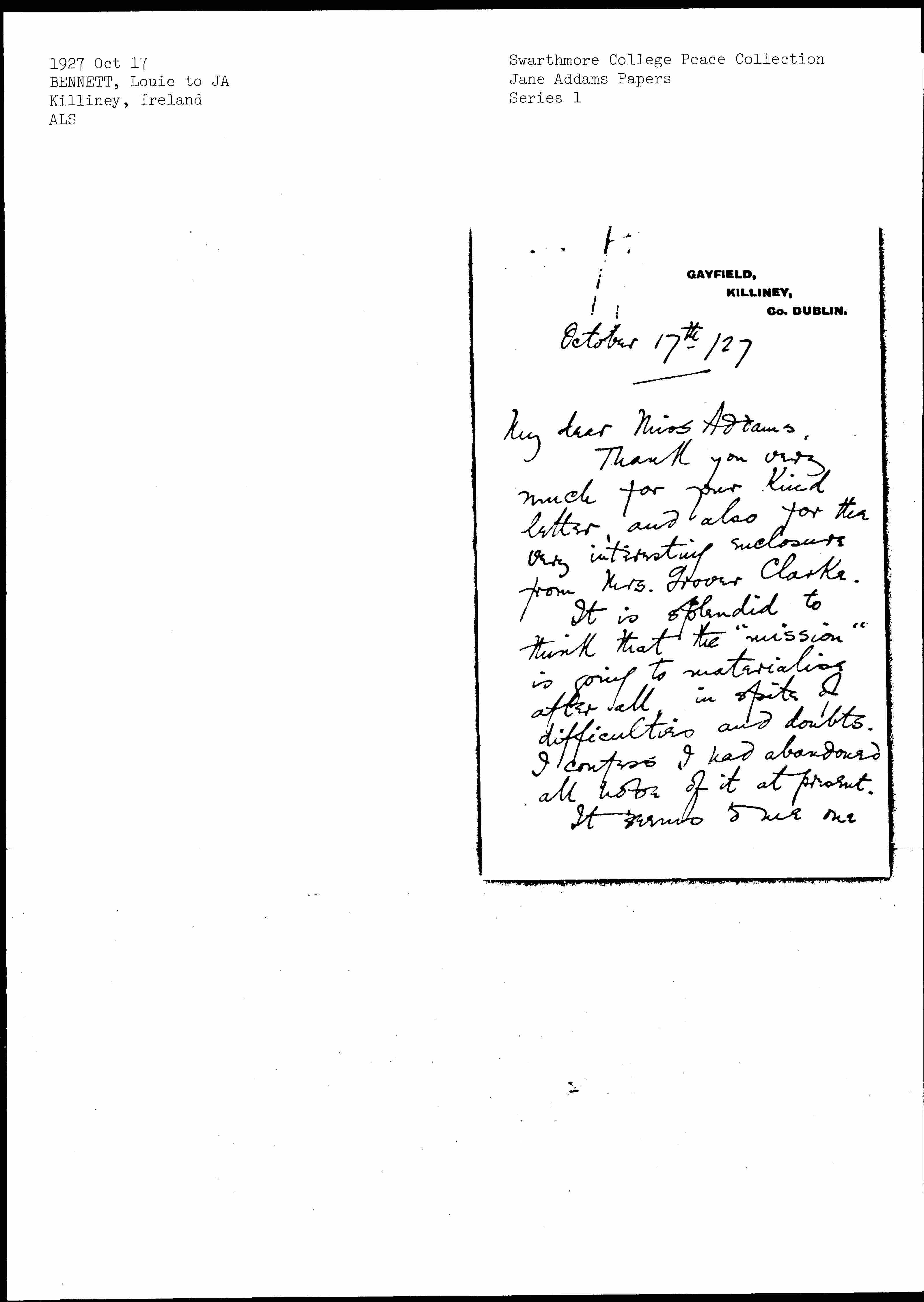 Thank you very much for your kind letter, and also for the very interesting enclosures from Mrs. Grover [Clark].