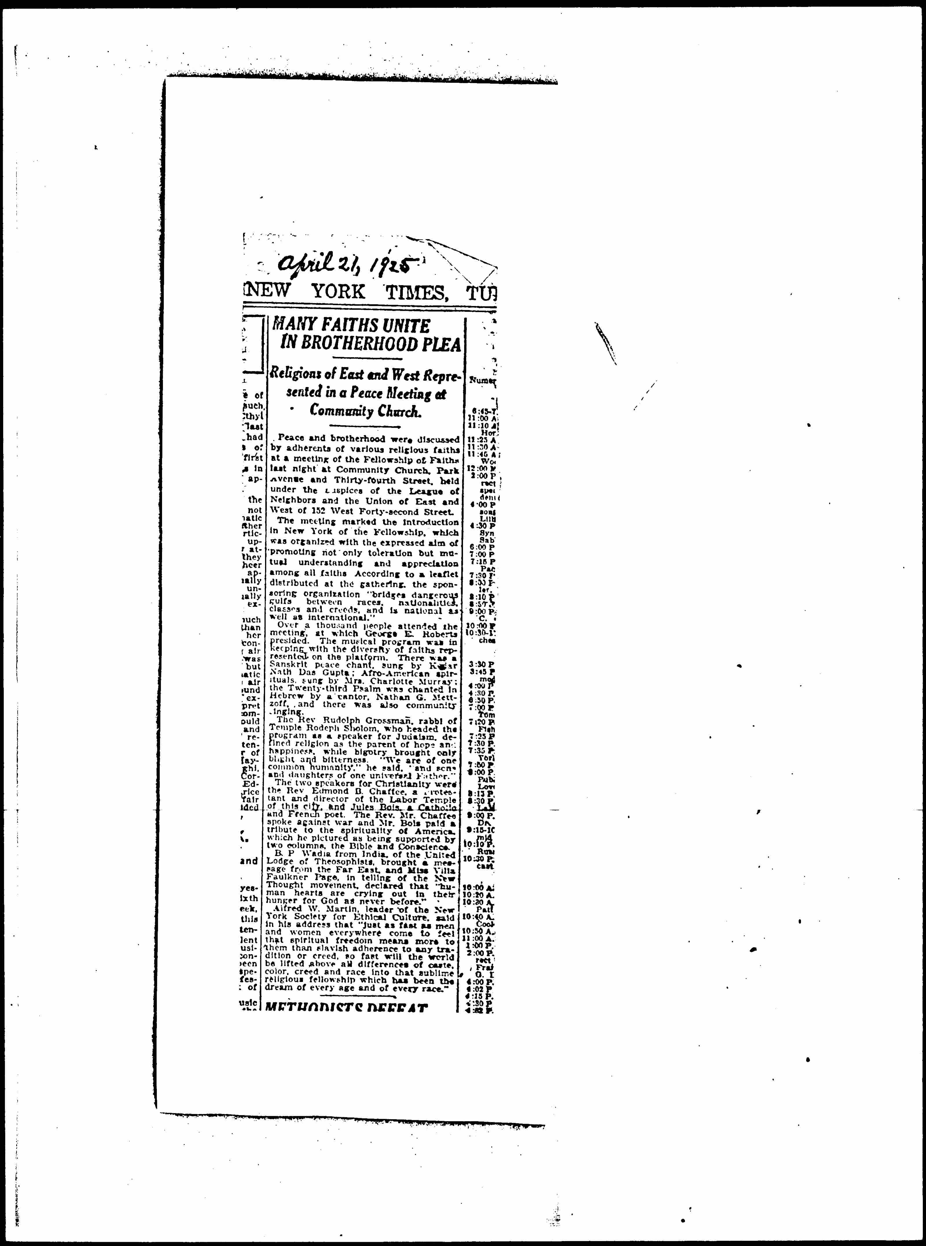The two speakers for Christianity were the Rev. Edmond B. Chaffee, a Protestant and director of the Labor Temple of this city, and Julies Bois, a Catholic and French poet. The Rev. Mr. Chaffee spoke against war and Mr. Bois paid a tribute to the spirituality of America, which he pictured as being supported by two columns, the Bible and Conscience.