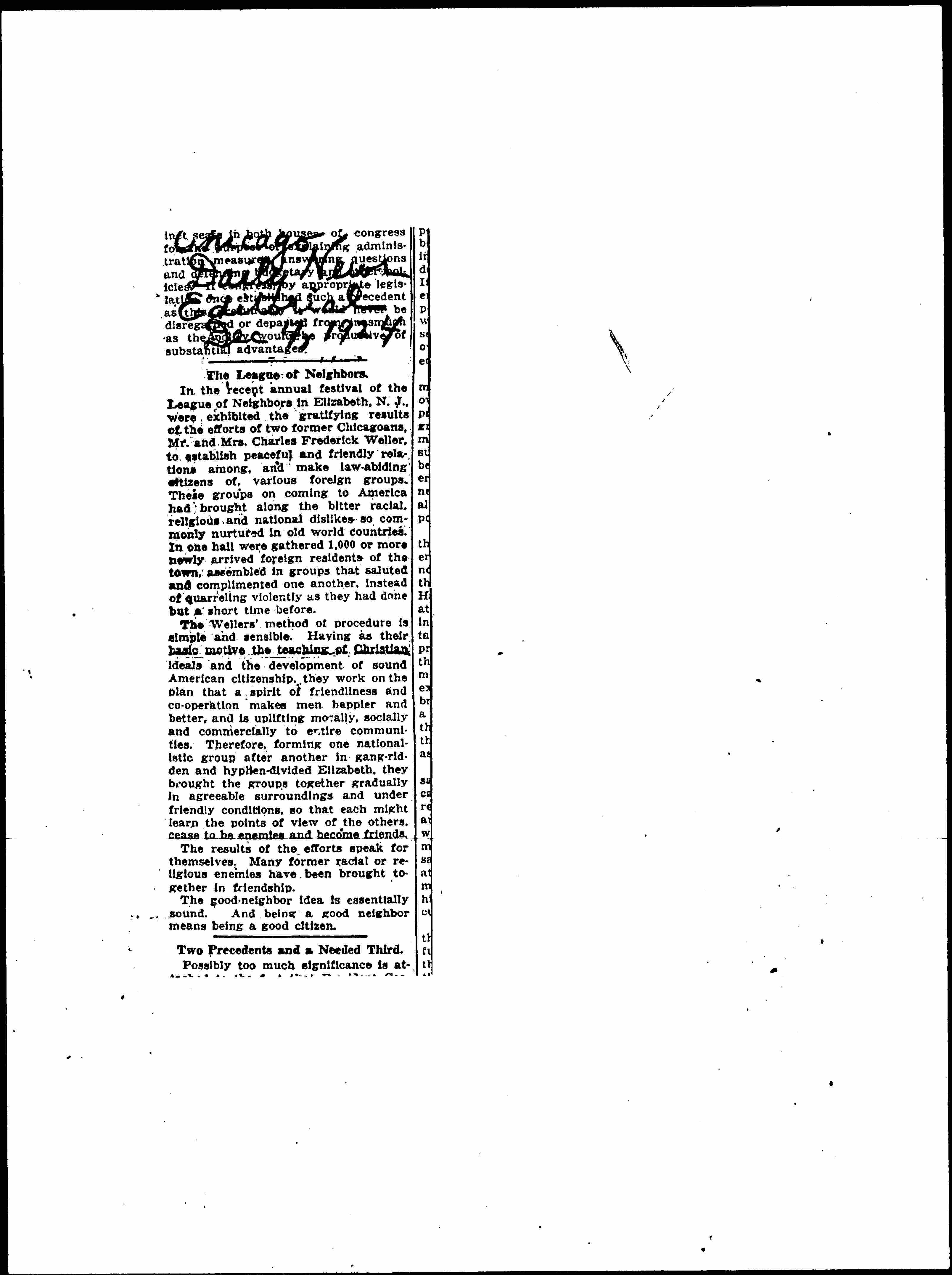 In the recent annual festival of the League of Neighbors in Elizabeth, N.J., were exhibited the gratifying results of the efforts of two former Chicagoans, Mr. and Mrs. Charles Frederick Weller, to establish peaceful and friendly relations among, and make law-abiding citizens of, various foreign groups. These groups on coming to America had brought along the bitter racial, religious and national dislikes so commonly nurtured in old world countries. In one hall were gathered 1,000 or more newly arrived foreign residents of the town, assembled in groups that saluted and complimented one another, instead of quarreling violently as they had done but a short time before.