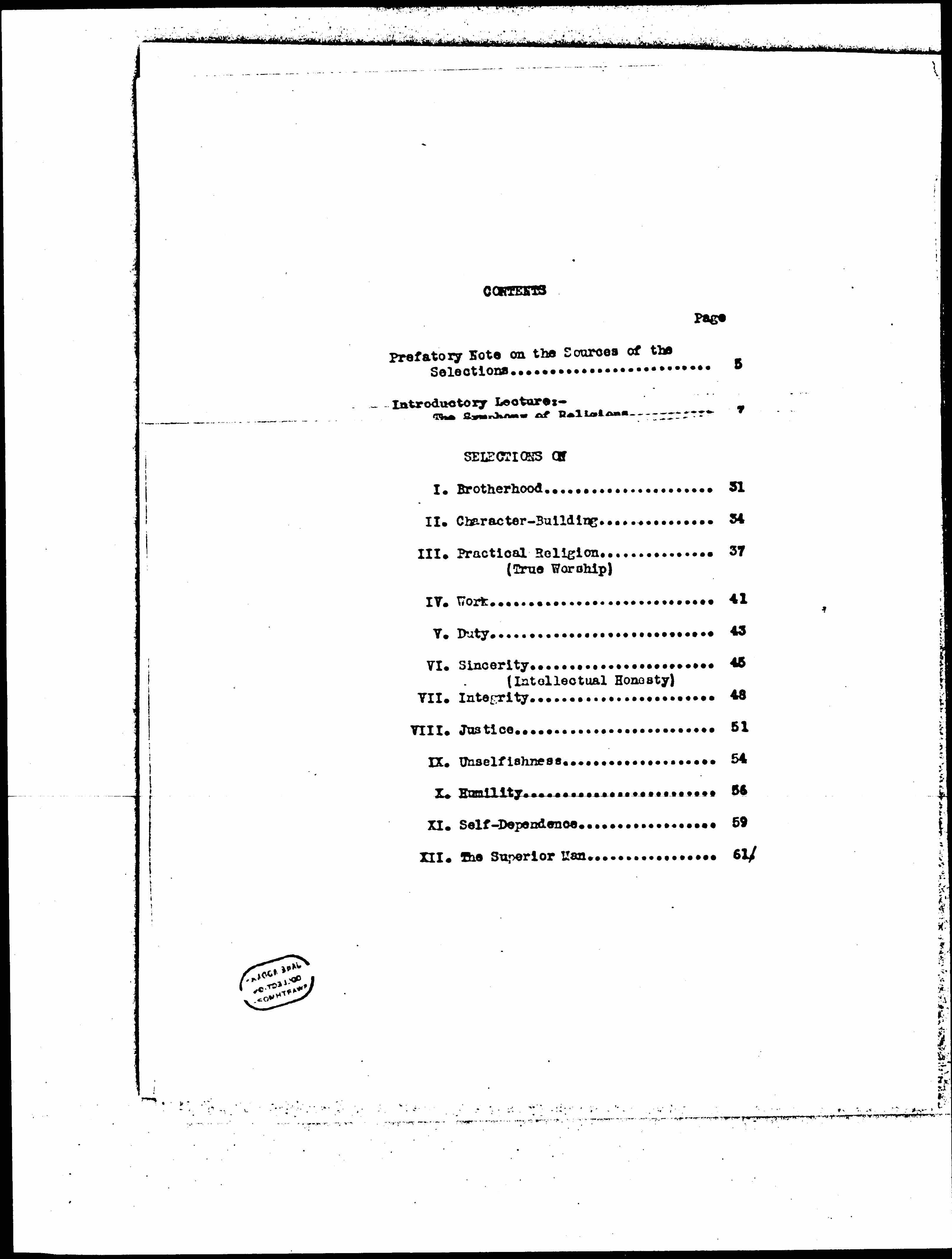 Brotherhood, Character-Building, Practical Religion (True Worship), Work, Sincerity, Integrity, Justice, Unselfishness, Humility, Self-dependence, The Superior Man, Wealth, Adversity, Good for Evil, Humaneness, Friendship, Love, The Purity of Truth, Control of Tongue, Tolerance, Catholicity or The Fraternity of Religions, The Test of Life, The Commonwealth of Man, The Ten Commandments of Judaism, Buddhis Beatitudes, Christian Beatitudes, The Divine Nature-God, Through Nature to God, Death and Immortality, Prayers.