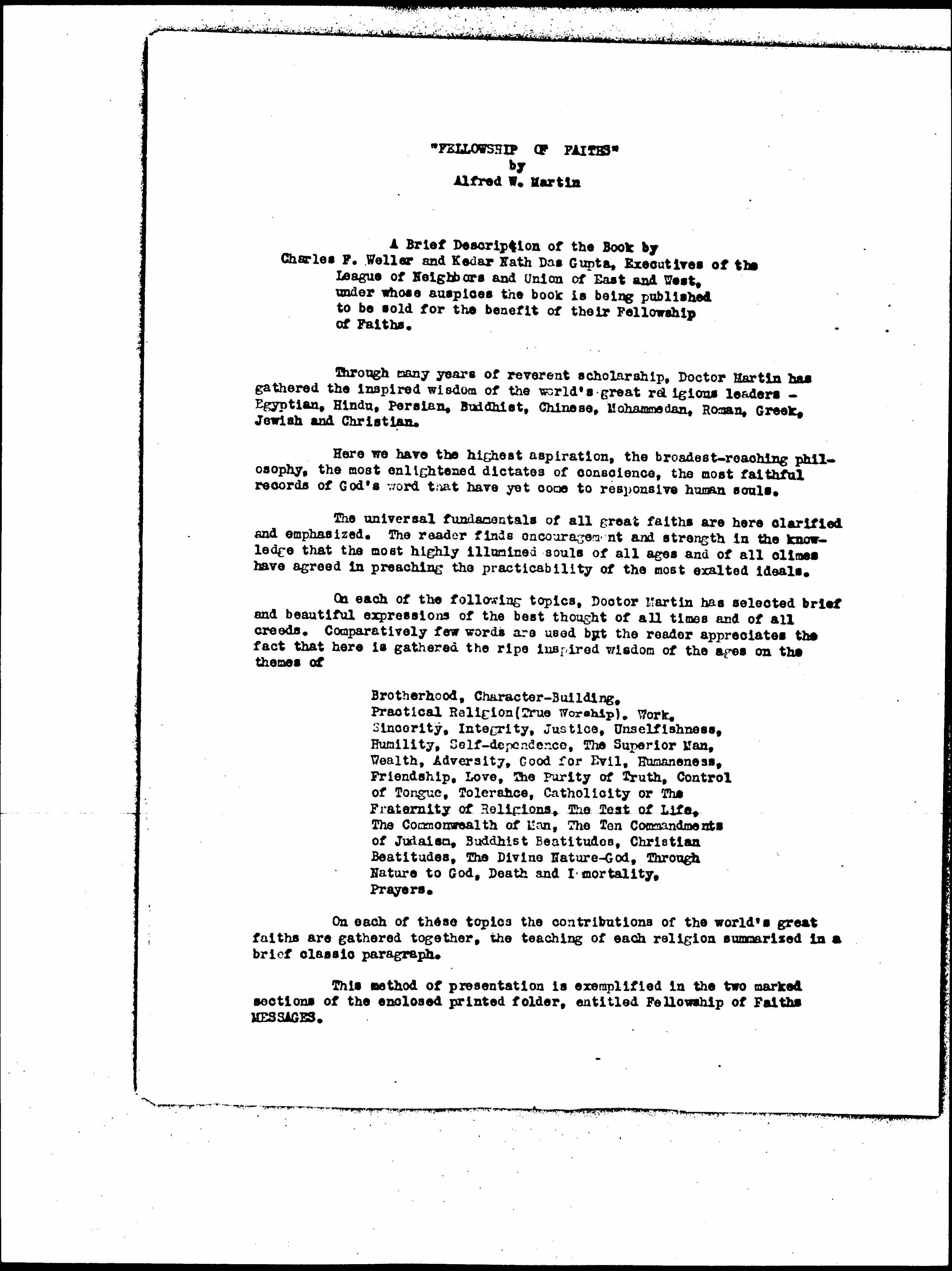 A Brief Description of the Book by Charles F. Weller and Kedar Kath Das Gupta, Executives of the League of Neighbors and Union of East and West, under whose auspices the book is being published to be sold for the benefit of their Fellowship of Faiths.
