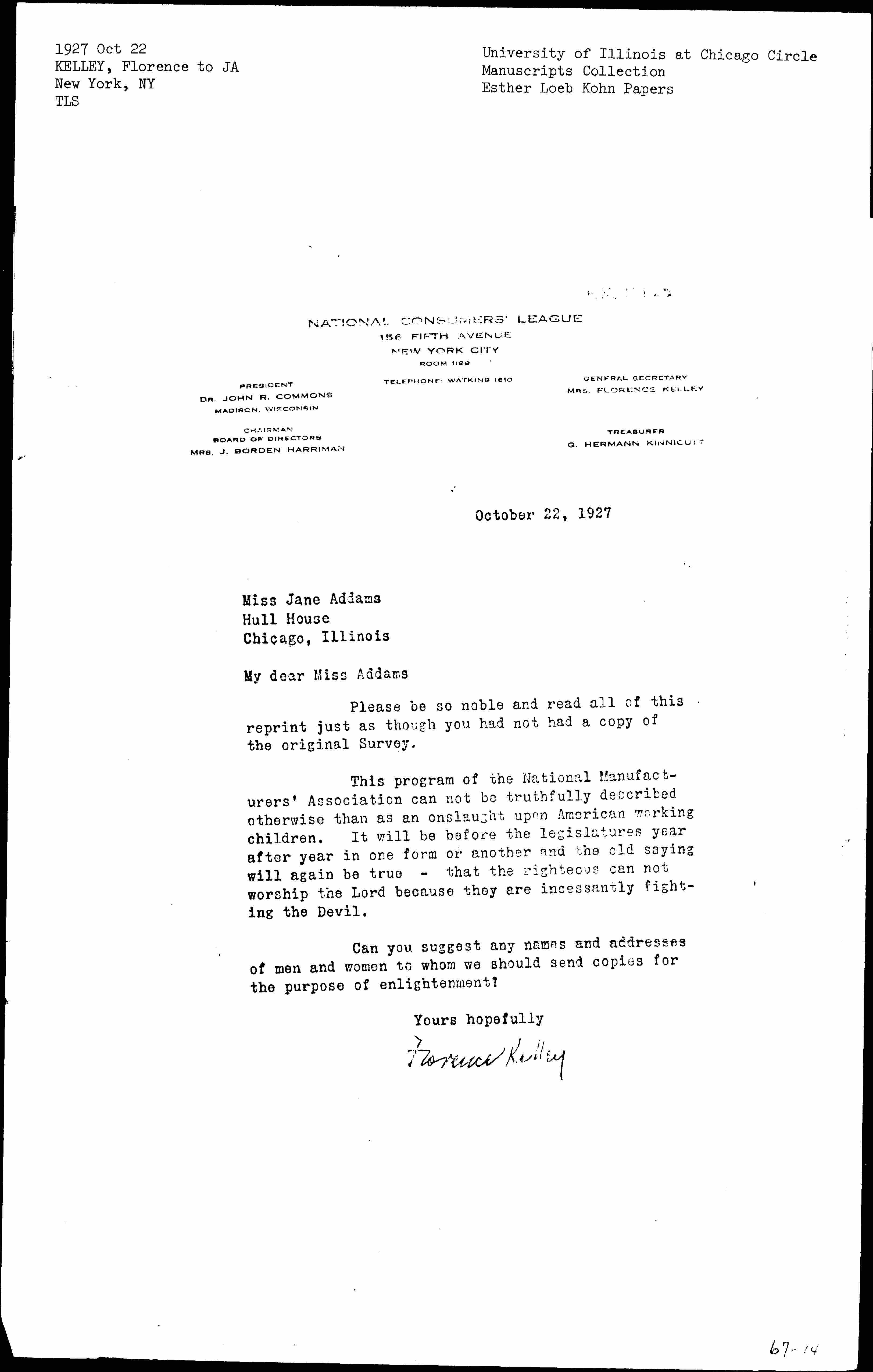 Florence Kelley to Jane Addams, October 22, 1927