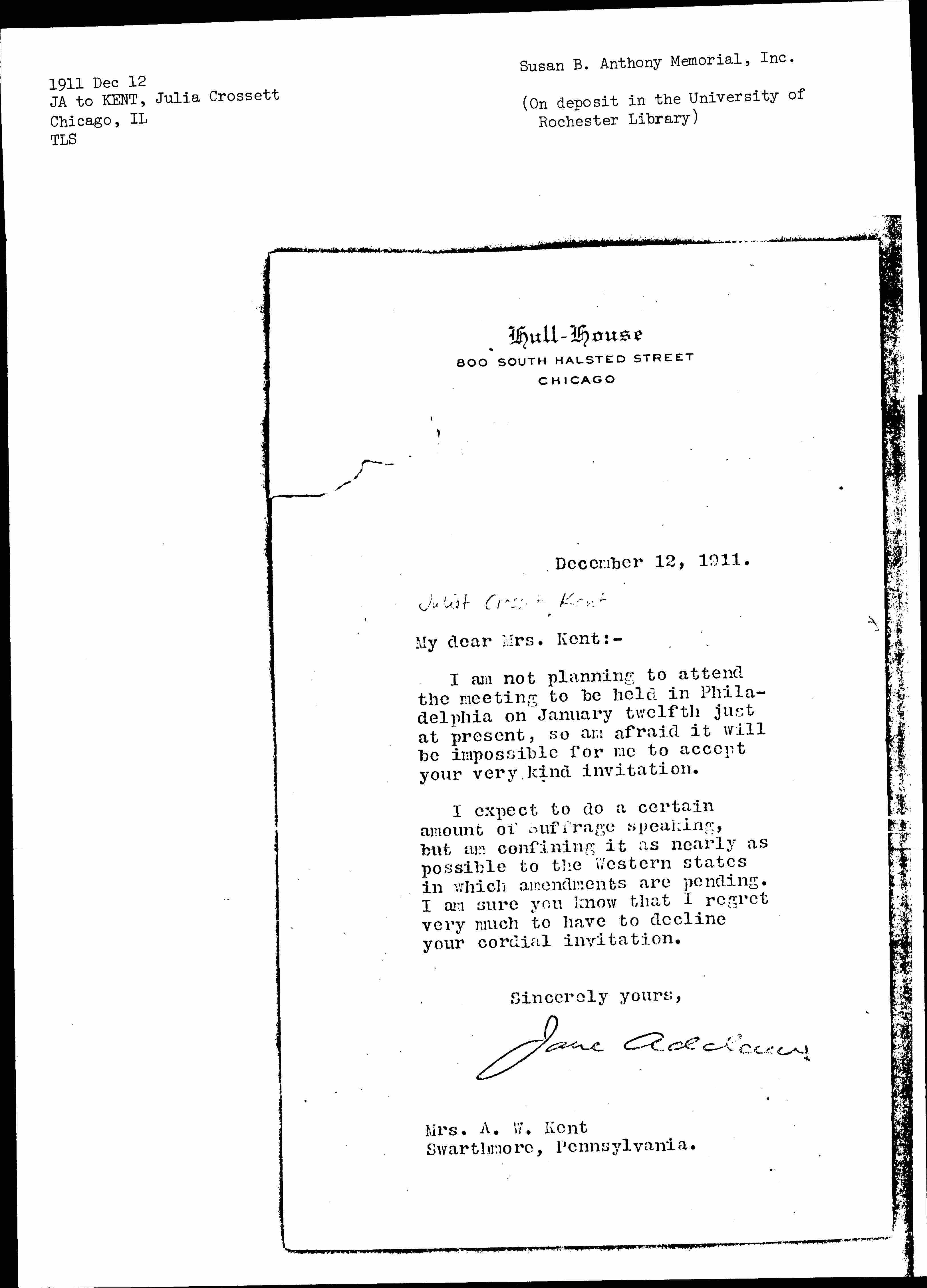 I expect to do a certain amount of Suffrage speaking, but am confining it as nearly as possible to the Western states in which amendments are pending. I am sure you know that I regret very much to have to decline your cordial invitation.