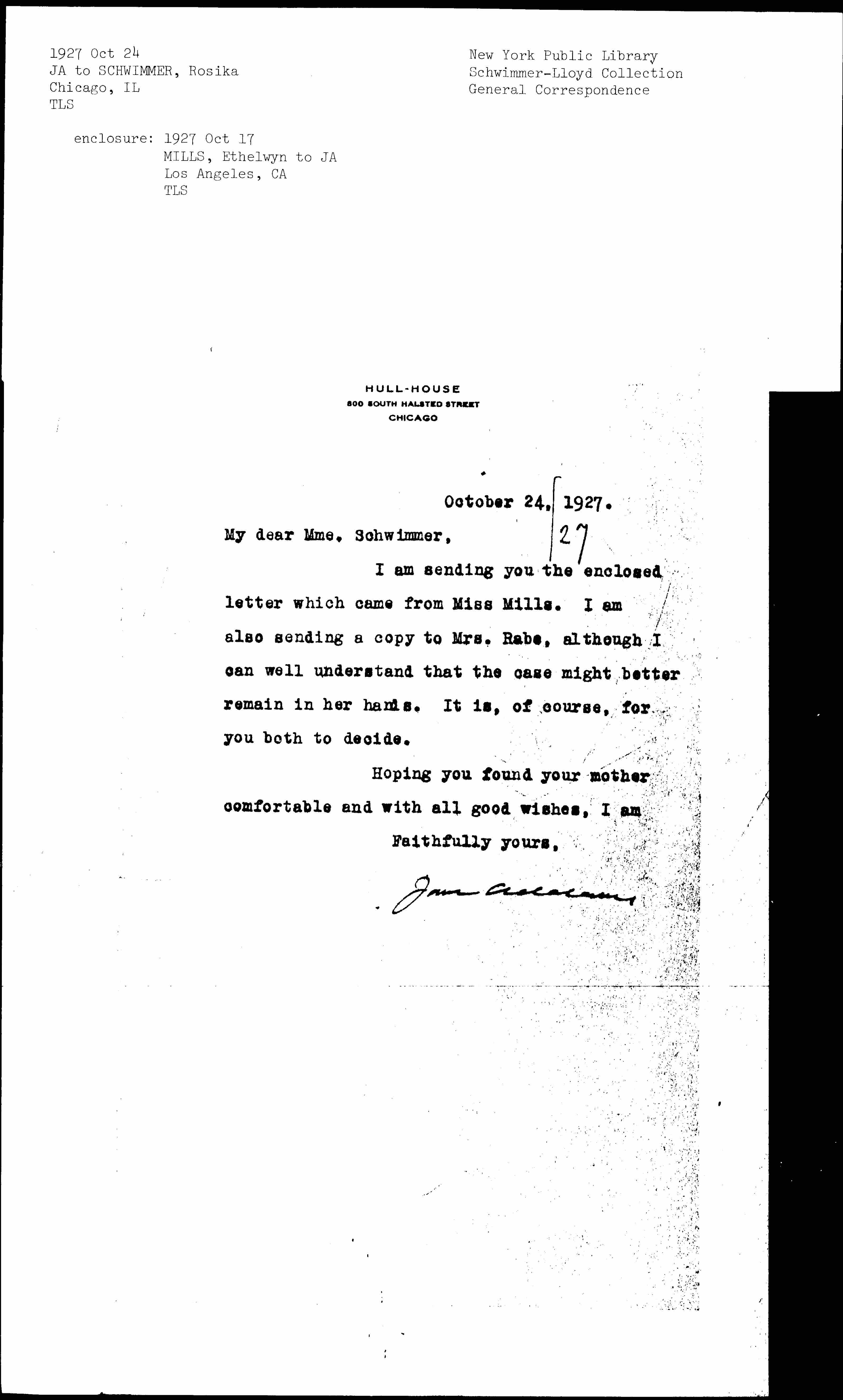 Jane Addams to Rosika Schwimmer, October 24, 1927