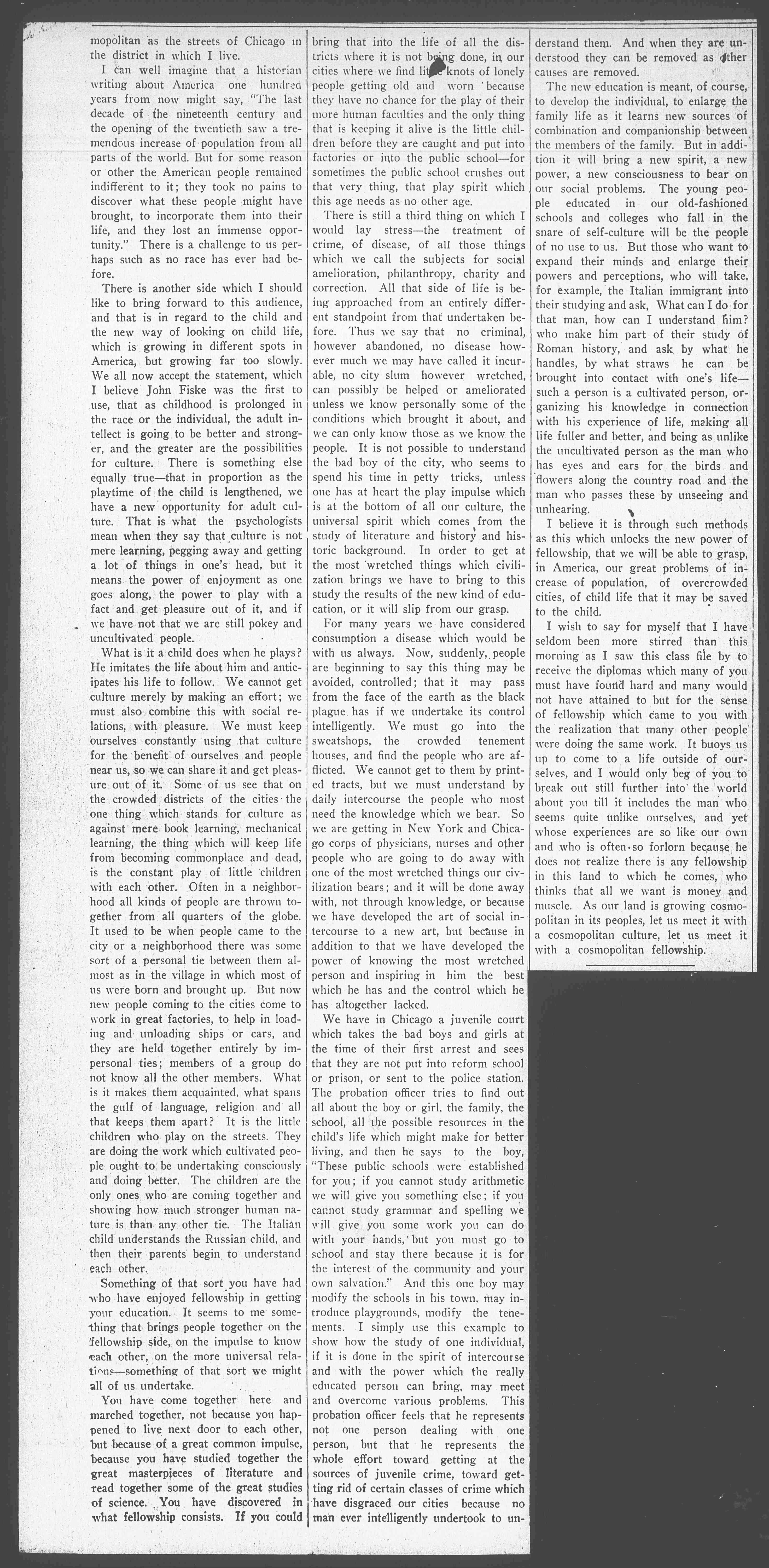 You have come together here and marched together, not because you happened to live next door to each other, but because of a great common impulse, because you have studied together the great masterpieces of literature and read together some of the great studies of science. You have discovered in what fellowship consists. If you could bring that into the life of all the districts where it is not being done, in our cities where we find little knots of lonely people getting old and worn because they have no chance for the play of their more human faculties and the only thing that is keeping it alive is the little children before they are caught and put into factories or into the public school-–for sometimes the public school crushes out that very thing, that play spirit which this age needs as no other age.