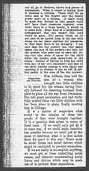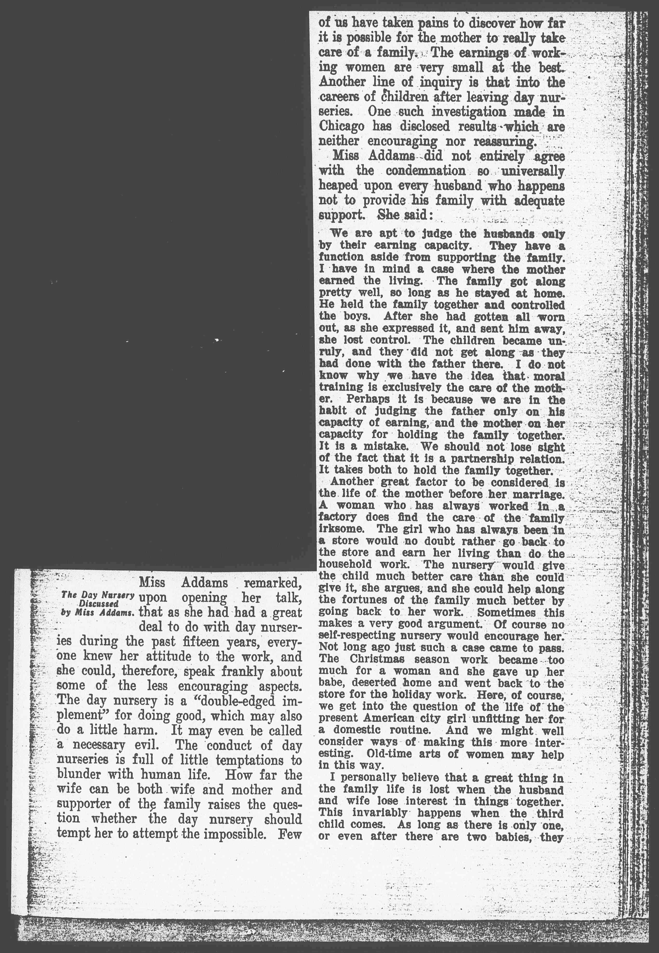 I personally believe that a great thing in the family life is lost when the husband and wife lose interest in things together. This invariably happens when the third child comes. As long as there is only one, or even after there are two babies, they [page 2] can all go to the theatres, shows and places of amusement. When it comes to taking three it becomes a problem. There must be an extra seat at the theatre and the family grows more of a burden. If there could be some way devised so that people could still have their pleasures together, even when there is a large family, it would be of great help. Some kind of a neighborhood arrangement that can supply this need would do good. The person whom we do not care to be parted from is the one with whom we can share together our pleasures. In that light there is no drudgery. I am sure that the day nursery can very easily lessen the care of the mother – not only for the mother who goes out to earn the living – but also when it cares for the child while the mother goes down-town to the stores. Instead of having to drag the child with her, to her own discomfort and that of the child, besides loading it with candy and exposing it to disease, it can be left in perfect safety in the care of the day nursery.