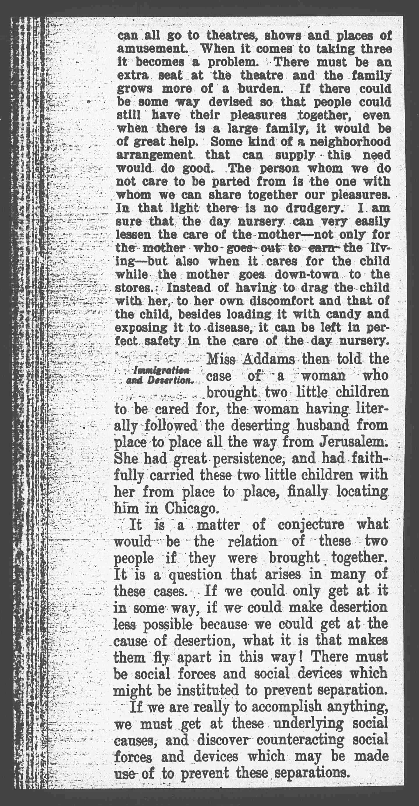Miss Addams then told the case of a woman who brought two little children to be cared for, the woman having literally followed the deserting husband from place to place all the way from Jerusalem. She had great persistence, and had faithfully carried these two little children with her from place to place, finally locating him in Chicago.