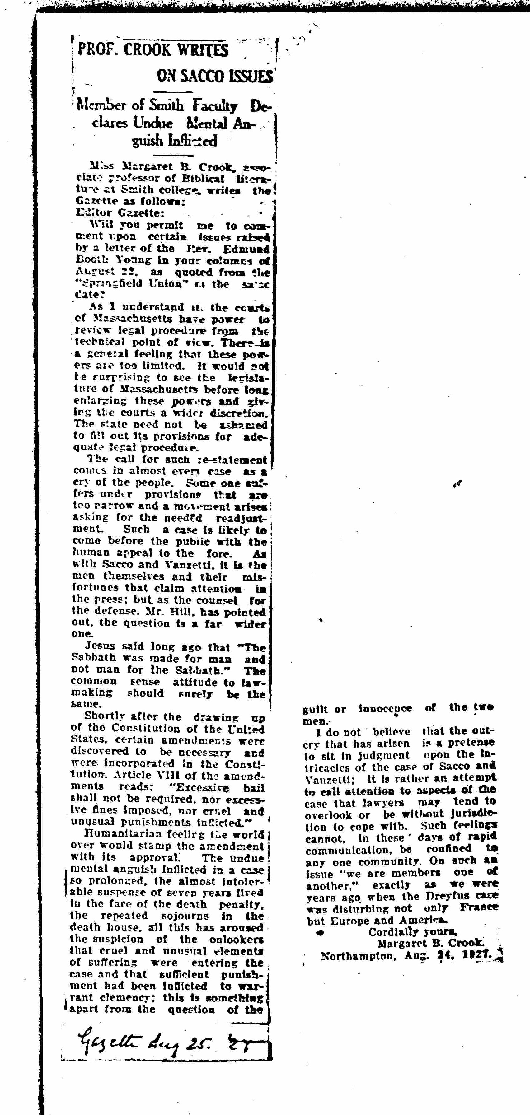 Miss Margaret B. Crook, associate professor of Biblical literature at Smith College, writes the Gazette as follows: