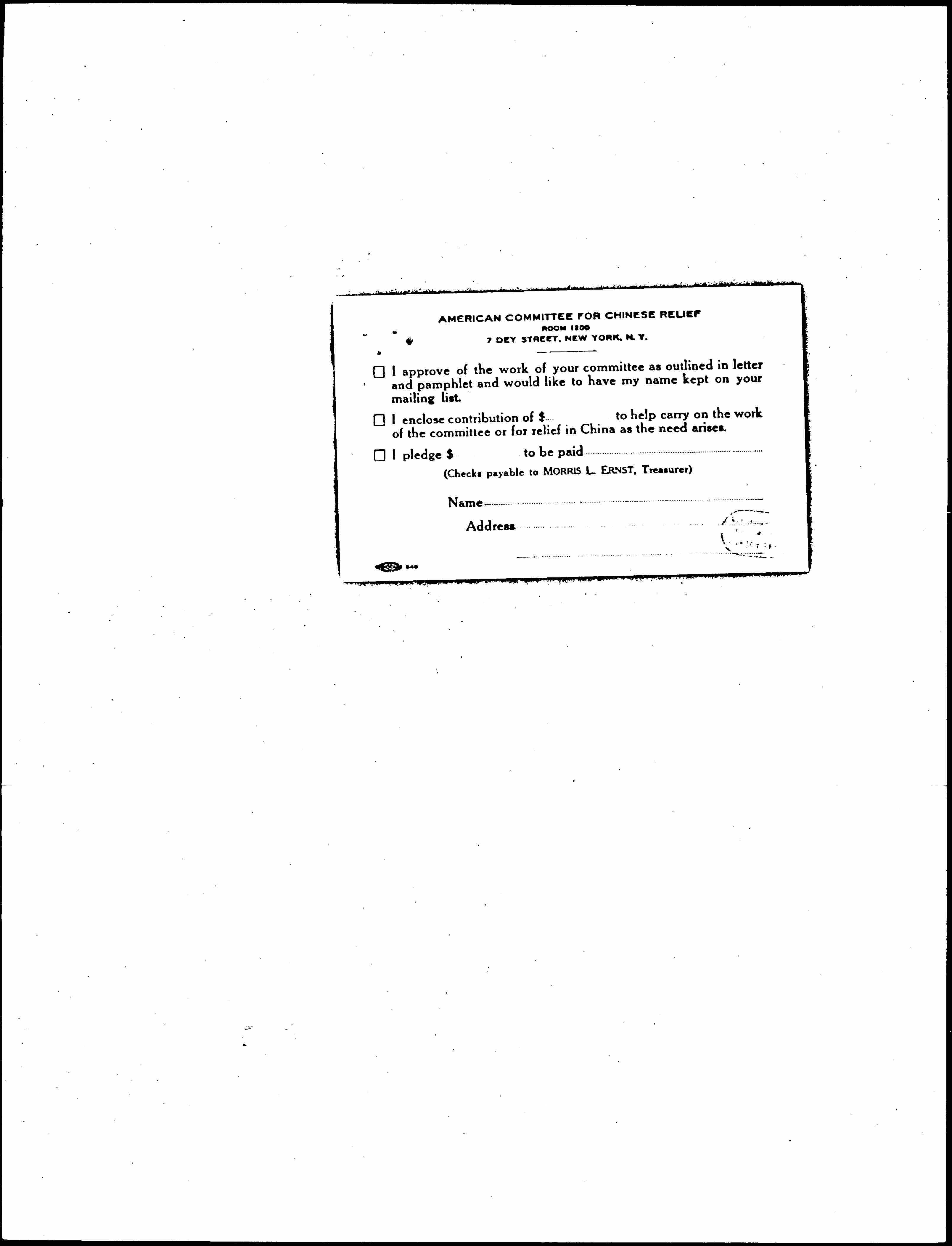 I enclose contribution of $... to help carry on the work of the committee or for relief in China as the need arises.
