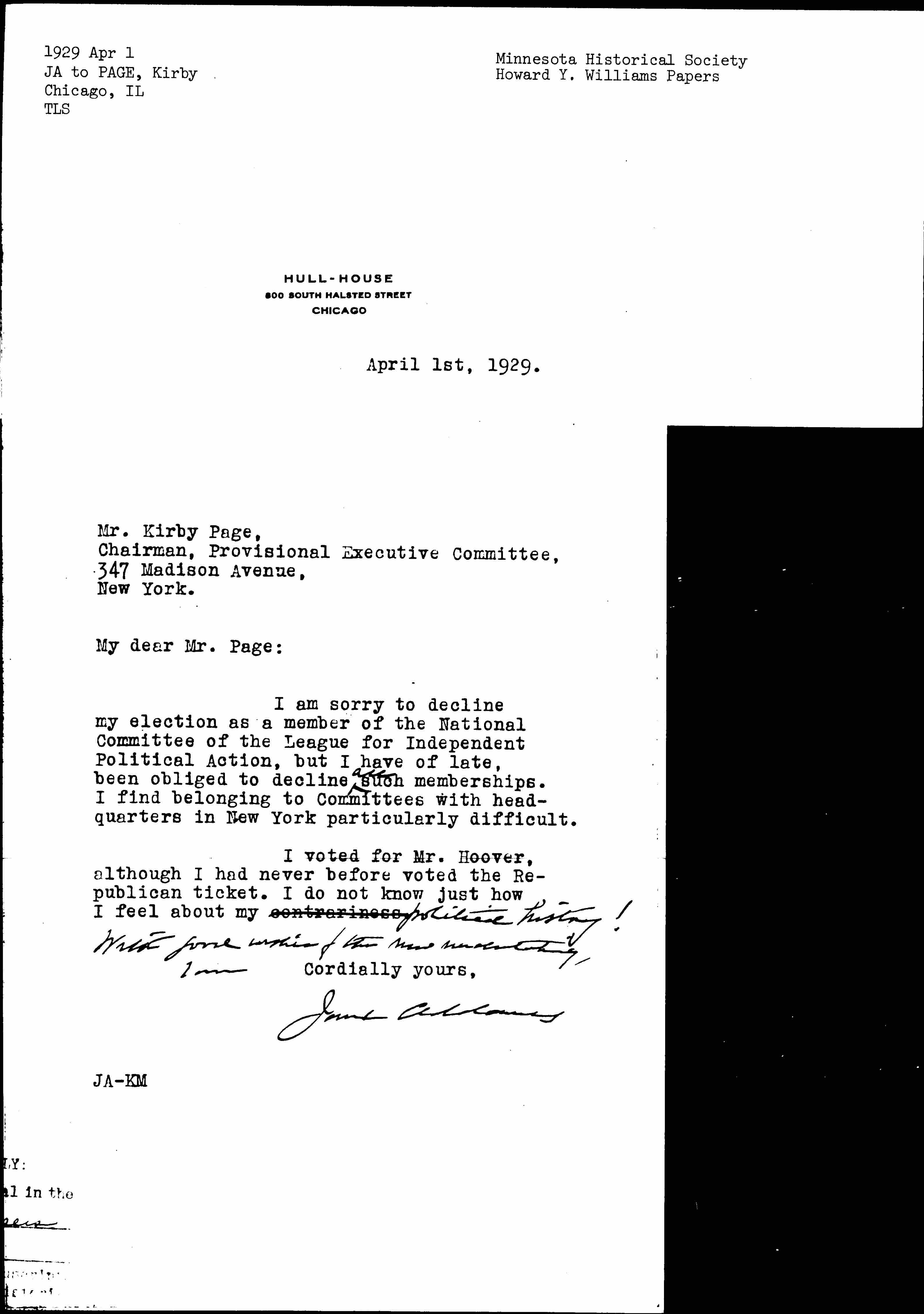 Jane Addams [signed]