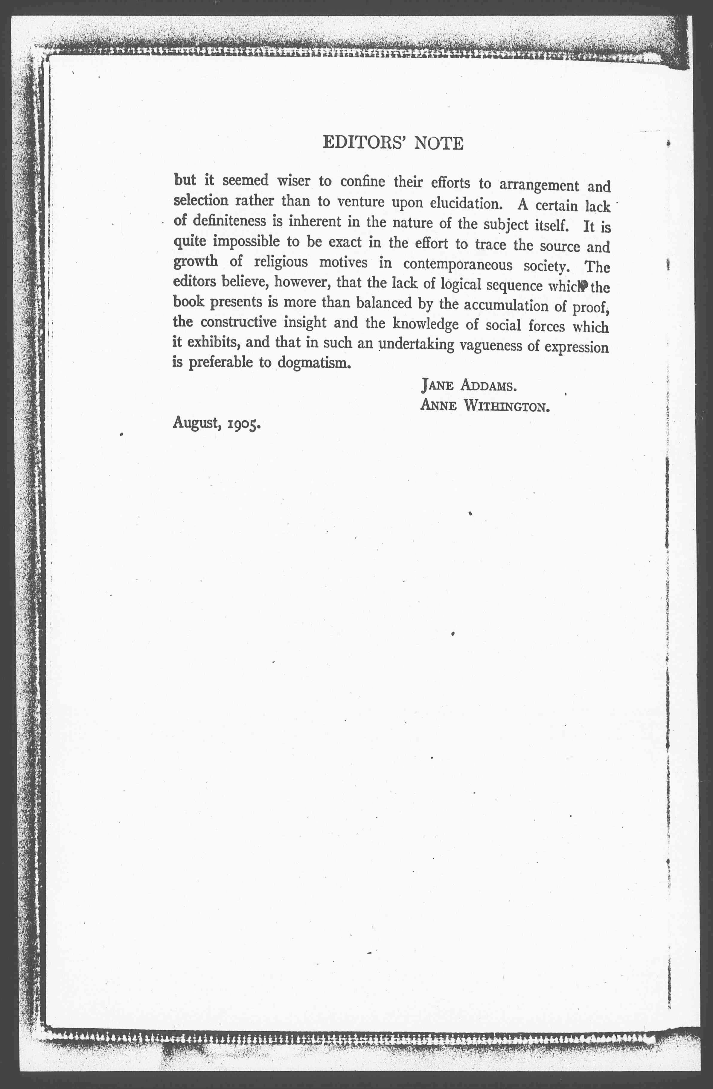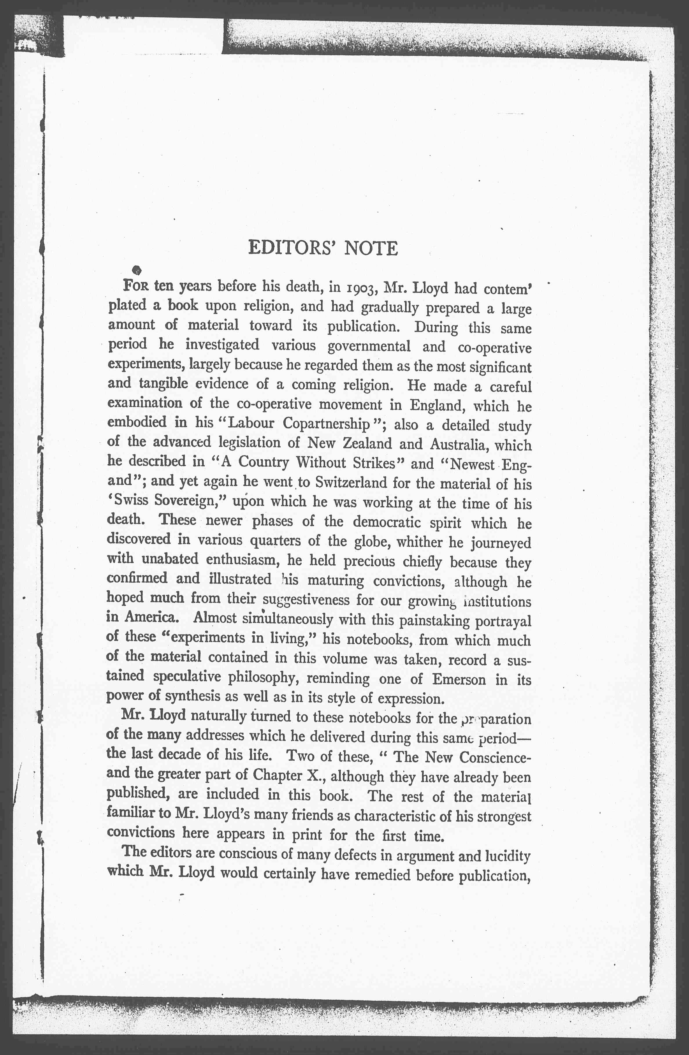 The editors are conscious of many defects in argument and lucidity which Mr. Lloyd would certainly have remedied before publication, [page 2] but it seemed wiser to confine their efforts to arrangement and selection rather than to venture upon elucidation. A certain lack of definiteness is inherent in the nature of the subject itself. It is quite impossible to be exact in the effort to trace the source and growth of religious motives in contemporaneous society. The editors believe, however, that the lack of logical sequence which the book presents is more than balanced by the accumulation of proof, the constructive insight and the knowledge of social forces which it exhibits, and that in such an undertaking vagueness of expression is preferable to dogmatism.