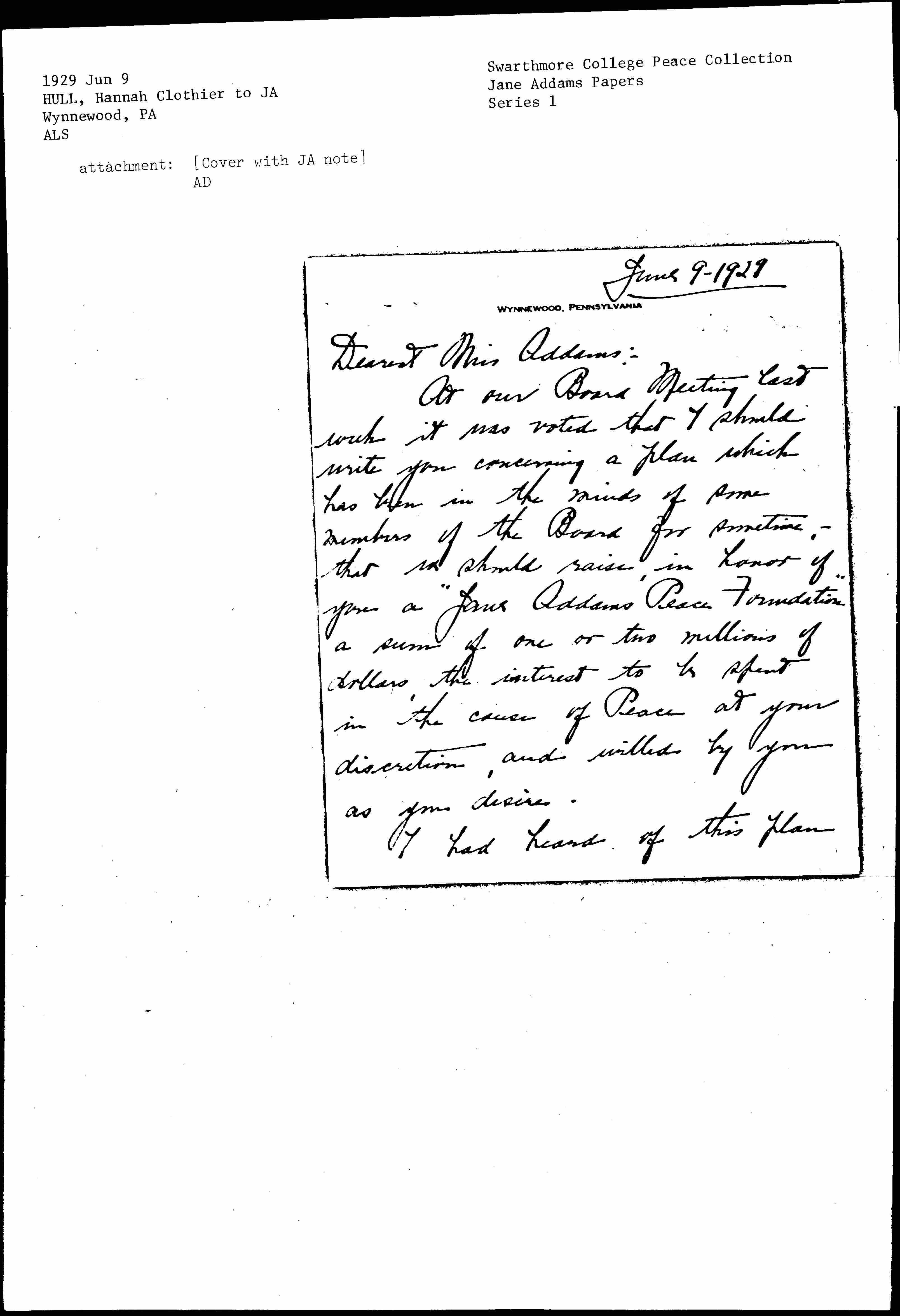 At our Board Meeting last week it was voted that I should write you concerning a plan which has been in the minds of some members of the Board for sometime -- that we should raise, in honor of you a "Jane Addams Peace Foundation" a sum of one or two millions of dollars, the interest to be spent in the cause of Peace at your discretion, and willed by you as you desire.