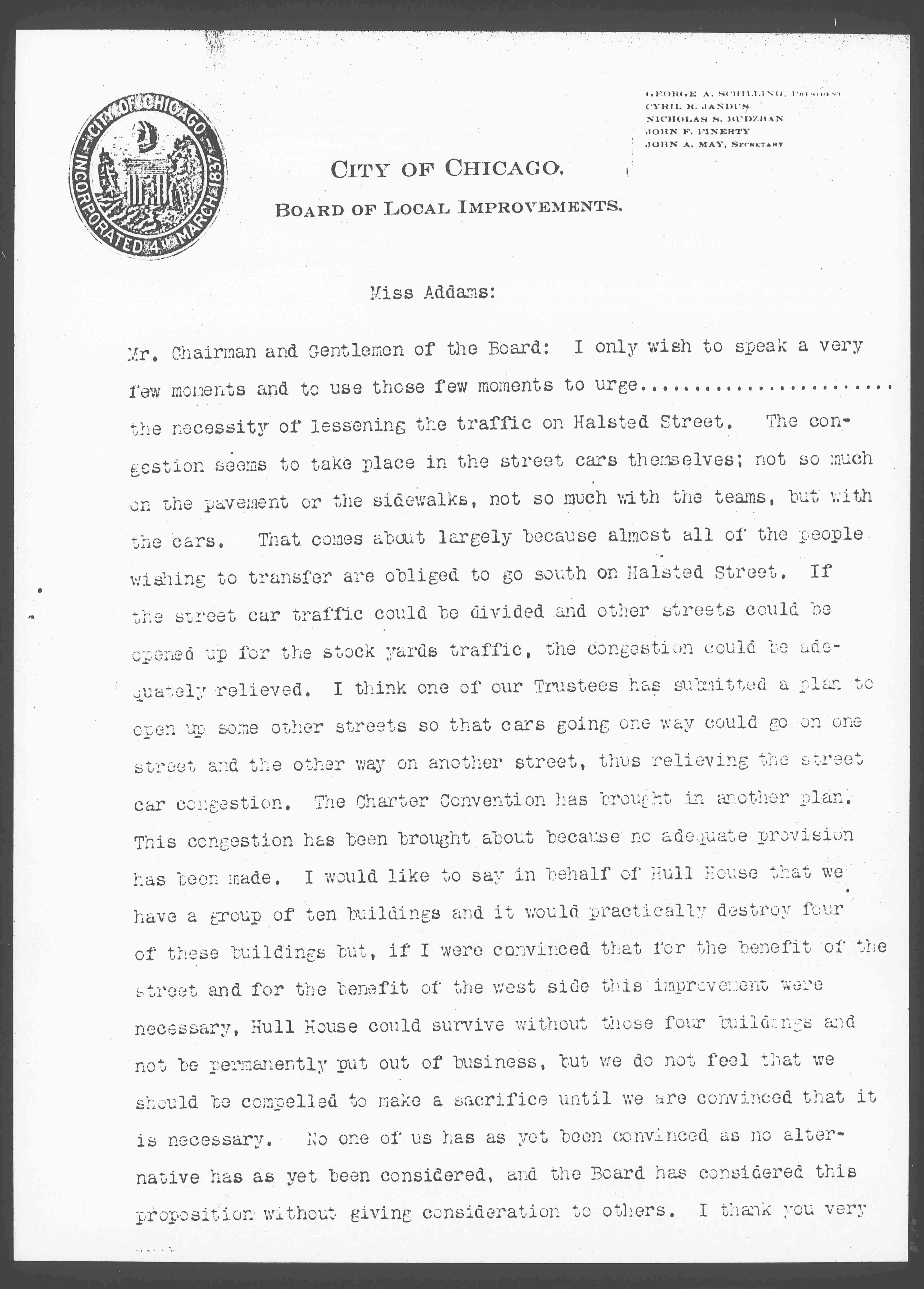 Mr. Chairman and Gentlemen of the Board: I only wish to speak a very few moments and to use those few moments to urge...the necessity of lessening the traffic on Halsted Street. The congestion seems to take place in the street cars themselves; not so much on the pavement or the sidewalks, not so much with the teams, but with the cars. That comes about largely because almost all of the people wishing to transfer are obliged to go south on Halsted Street. If the street car traffic could be divided and other streets could be opened up for the stock yards traffic, the congestion could be adequately relieved. I think one of our Trustees has submitted a plan to open up some other streets so that cars going one way could go on one street and the other way on another street, thus relieving the street car congestion. The Charter Convention has brought in another plan. This congestion has been brought about because no adequate provision has been made. I would like to say in behalf of Hull House that we have a group of ten buildings and it would practically destroy four of these buildings but, if I were convinced that for the benefit of the street and for the benefit of the west side this improvement were necessary, Hull House could survive without those four buildings and not be permanently put out of business, but we do not feel that we should be compelled to make a sacrifice until we are convinced that it is necessary. No one of us has as yet been convinced as no alternative has as yet been considered, and the Board has considered this proposition without giving consideration to others. I thank you very [much].