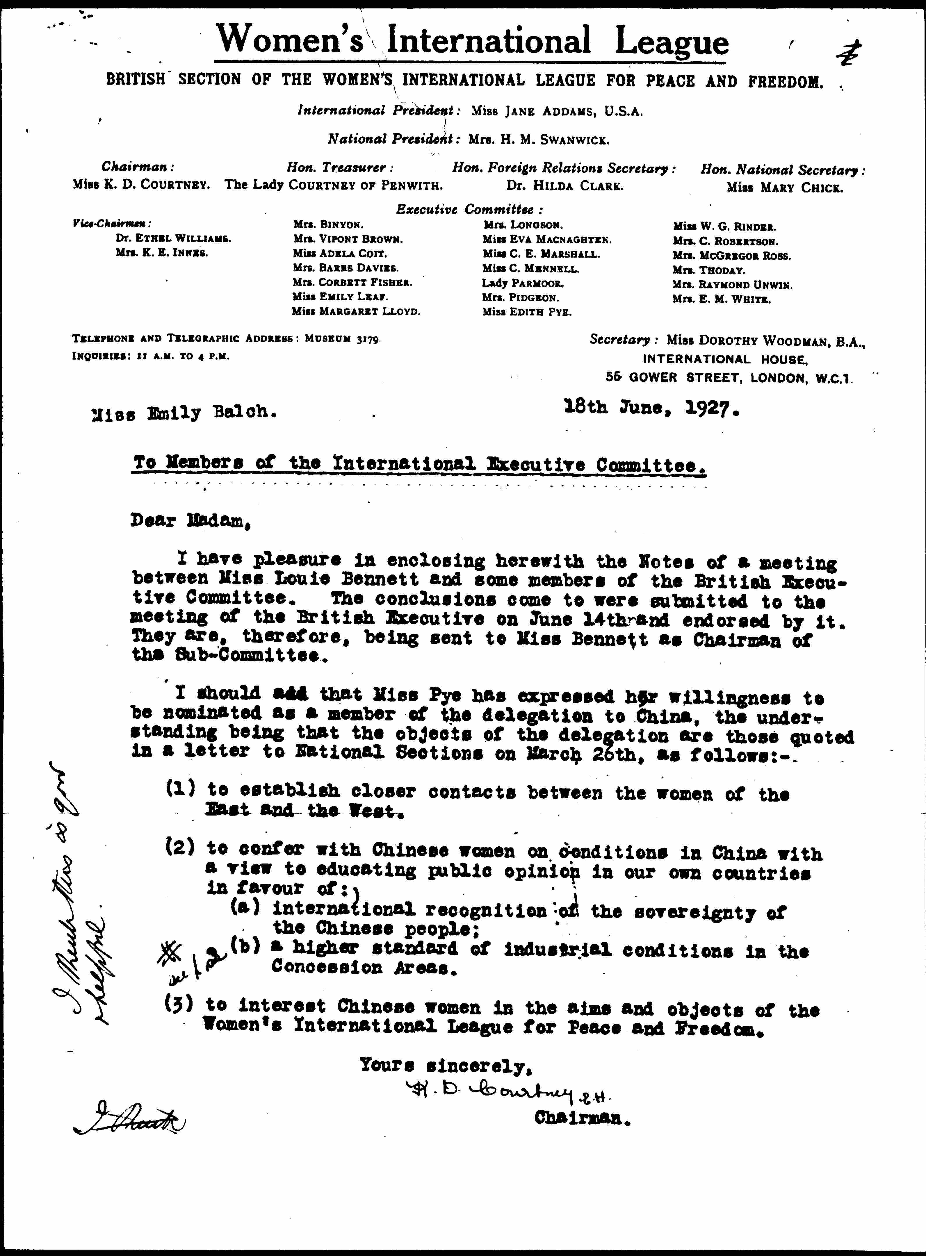 I should add that Miss Pye has expressed her willingness to be nominated as a member of the delegation to China, the understanding being that the objects of the delegation are those quoted in a letter to National Sections on March 26th; as follows: