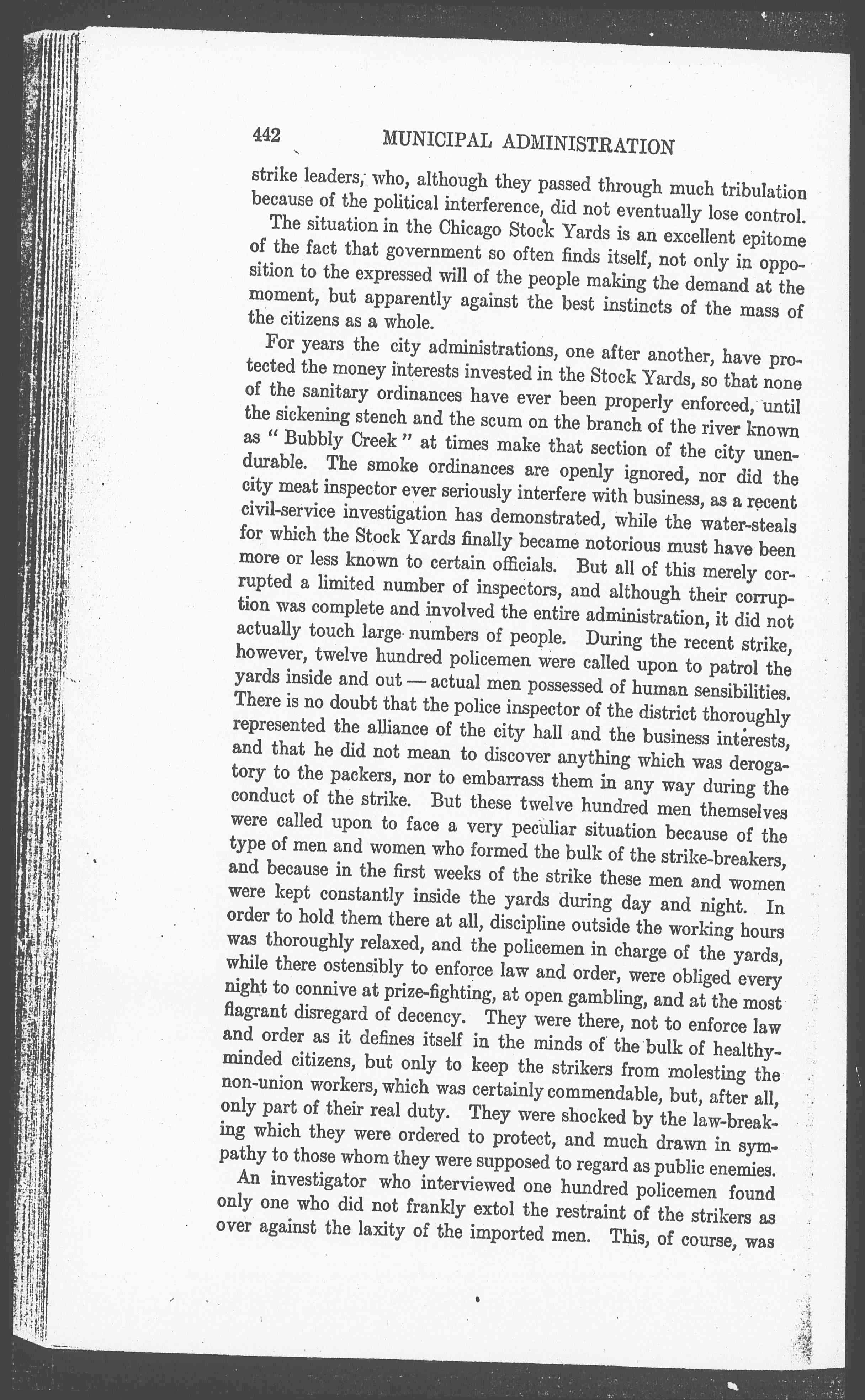 For years the city administrations, one after another, have protected the money interests invested in the Stock Yards, so that none of the sanitary ordinances have ever been properly enforced, until the sickening stench and the scum on the branch of the river known as "Bubbly Creek" at times make that section of the city unendurable. The smoke ordinances are openly ignored, nor did the city meat inspector ever seriously interfere with business, as a recent civil-service investigation has demonstrated, while the water-steals for which the Stock Yards finally became notorious must have been more or less known to certain officials. But all of this merely corrupted a limited number of inspectors, and although their corruption was complete and involved the entire administration, it did not actually touch large numbers of people. During the recent strike, however, twelve hundred policemen were called upon to patrol the yards inside and out -- actual men possessed of human sensibilities. There is no doubt that the police inspector of the district thoroughly represented the alliance of the city hall and the business interests, and that he did not mean to discover anything which was derogatory to the packers, nor to embarrass them in any way during the conduct of the strike. But these twelve hundred men themselves were called upon to face a very peculiar situation because of the type of men and women who formed the bulk of the strike-breakers, and because in the first weeks of the strike these men and women were kept constantly inside the yards during day and night. In order to hold them there at all, discipline outside the working hours was thoroughly relaxed, and the policemen in charge of the yards, while there ostensibly to enforce law and order, were obliged every night to connive at prize-fighting, at open gambling, and at most flagrant disregard of decency. They were there, not to enforce law and order as it defines itself in the minds of the bulk of healthy-minded citizens, but only to keep the strikers from molesting the non-union workers, which was certainly commendable, but, after all, only part of their real duty. They were shocked by the law-breaking which they were ordered to protect, and much drawn in sympathy to those whom they were supposed to regard as public enemies.
