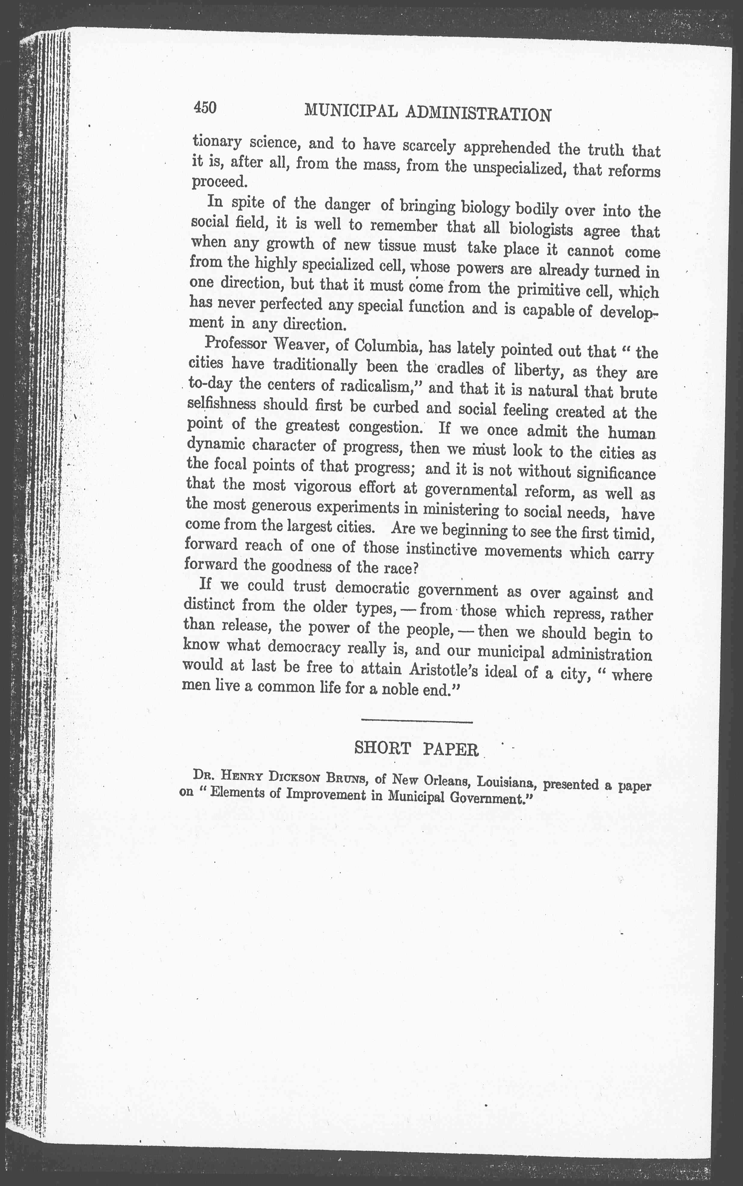 To demand protection from these so-called barbarians in our midst, who are supposed to issue forth from the shallows of the city and to seize upon the life and treasure of the citizens, as barbarians of old came from outside the city walls, is, of course, not to have read the first lessons of self-government in the light of evolutionary [page 17] science, and to have scarcely apprehended the truth that it is, after all, from the mass, from the unspecialized, that reforms proceed.