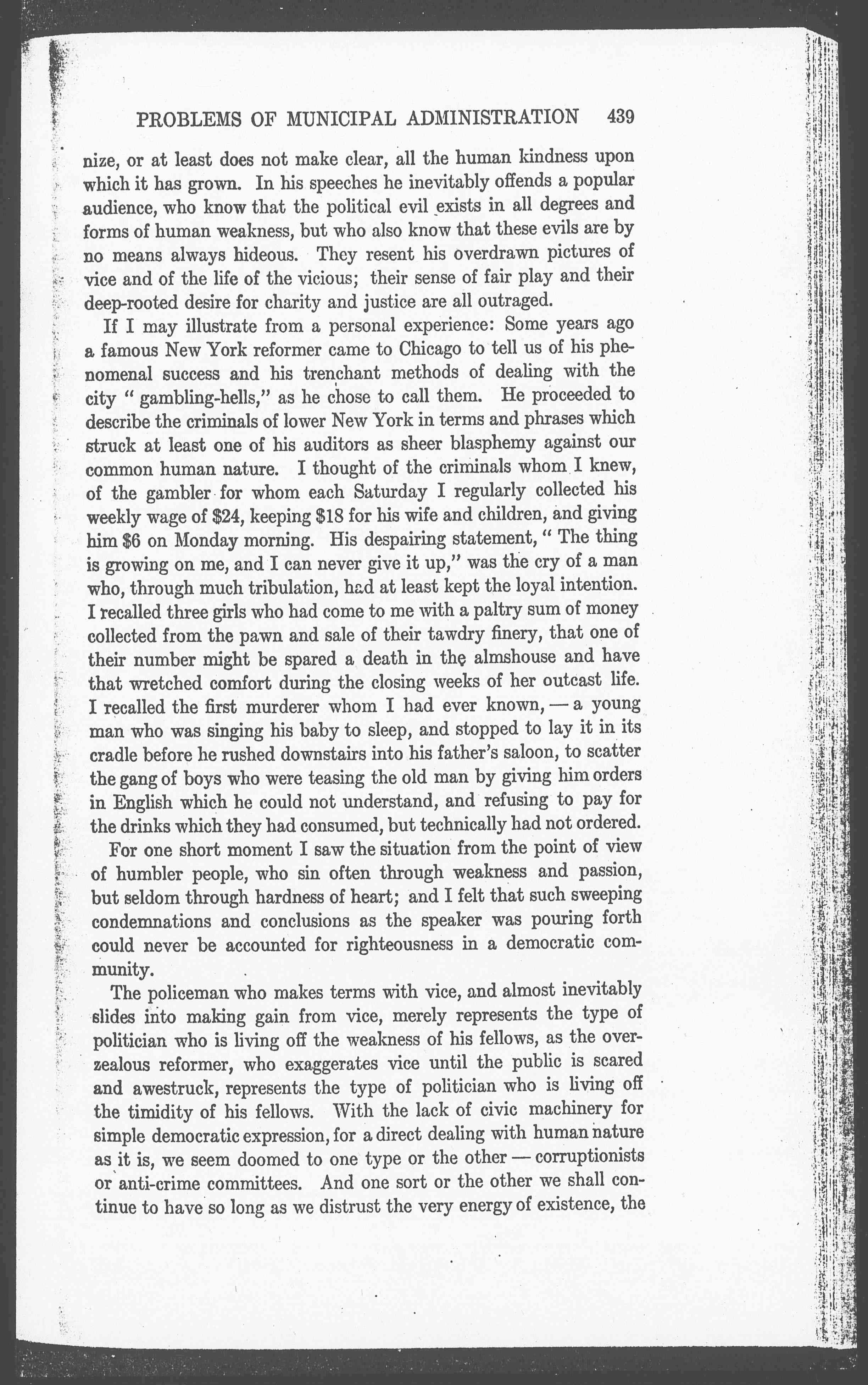 If I may illustrate from a personal experience: Some years ago a famous New York reformer came to Chicago to tell us of his phenomenal success and his trenchant methods of dealing with the city "gambling-hells," as he chose to call them. He proceeded to describe the criminals of lower New York in terms and phrases which struck at least one of his auditors as sheer blasphemy against our common human nature. I thought of the criminals whom I knew, of the gambler for whom each Saturday I regularly collected his weekly wage of $24, keeping $18 for his wife and children, and giving him $6 on Monday morning. His despairing statement, "The thing is growing on me, and I can never give it up," was the cry of a man who, through much tribulation, had at least kept the loyal intention. I recalled three girls who had come to me with a paltry sum of money collected from the pawn and sale of their tawdry finery, that one of their number might be spared a death in the almshouse and have that wretched comfort during the closing weeks of her outcast life. I recalled the first murderer whom I had ever known, -- a young man who was singing his baby to sleep, and stopped to lay it in its cradle before he rushed downstairs into his father's saloon, to scatter the gang of boys who were teasing the old man by giving him orders in English which he could not understand, and refusing to pay for the drinks which they had consumed, but technically had not ordered.