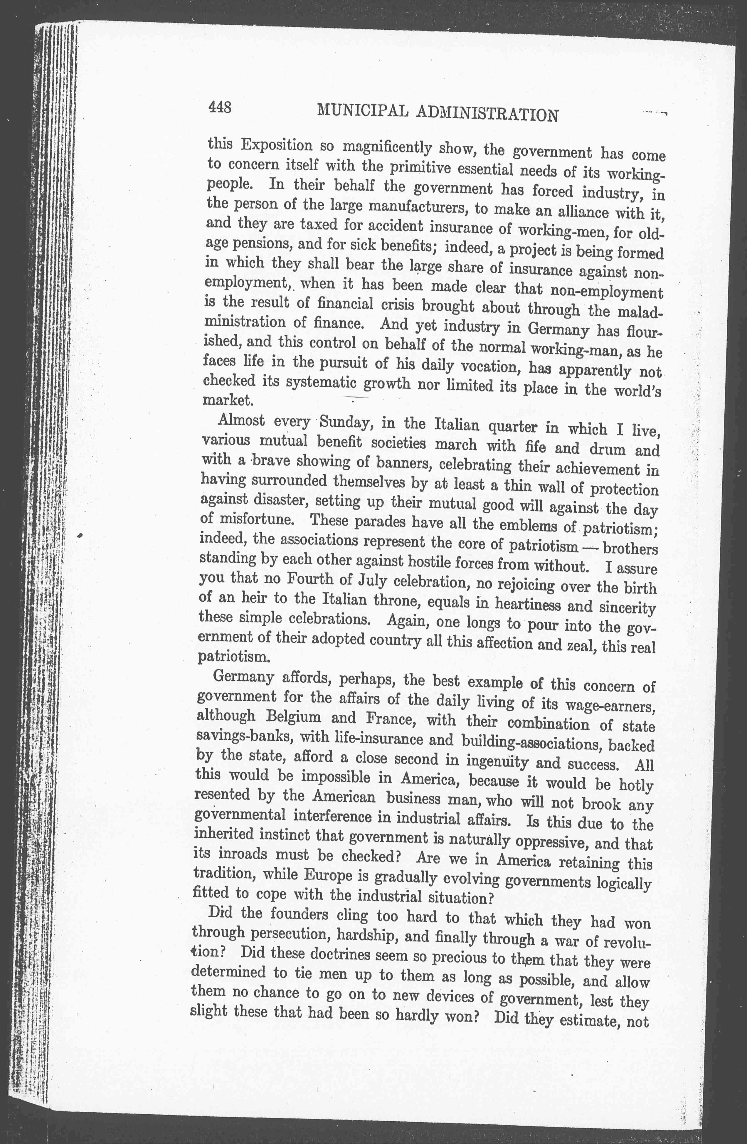 In Germany, as the municipal and social-economic exhibits of [page 15] this Exposition so magnificently show, the government has come to concern itself with the primitive essential needs of its working-people. In their behalf the government has forced industry, in the person of the large manufacturers, to make an alliance with it, and they are taxed for accident insurance of working-men, for old-age pensions, and for sick benefits; indeed, a project is being formed in which they shall bear the large share of insurance against non-employment, when it has been made clear that non-employment is the result of financial crisis brought about through the maladministration of finance. And yet industry in Germany has flourished, and this control on behalf of the normal working-man, as he faces life in the pursuit of his daily vocation, has apparently not checked its systematic growth not limited its place in the world's market.
