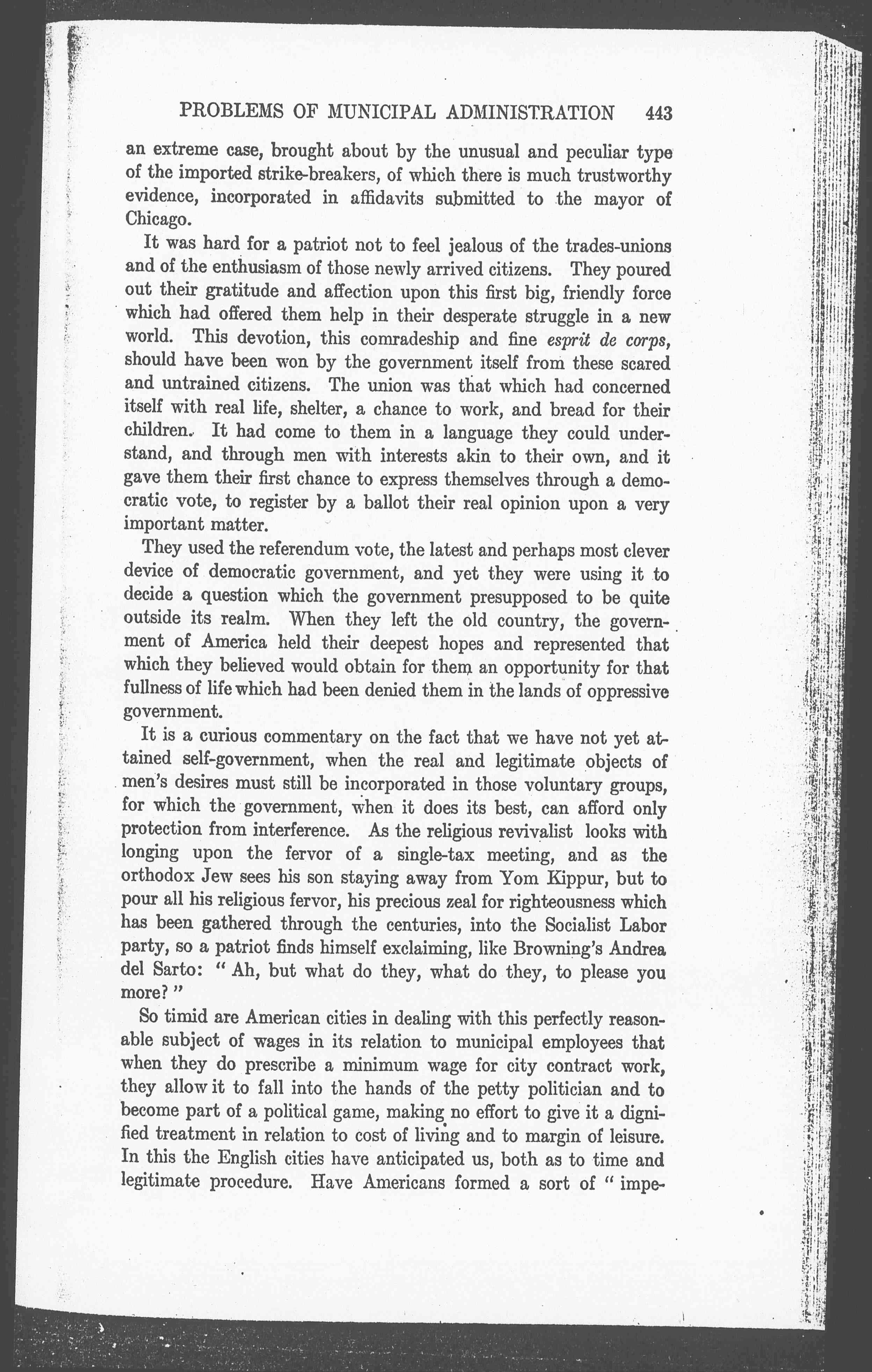 So timid are American cities in dealing with this perfectly reasonable subject of wages in its relation to municipal employees that when they do prescribe a minimum wage for city contract work, they allow it to fall into the hands of the petty politician and to become part of a political game, making no effort to give it a dignified treatment in relation to cost of living and to margin of leisure. In this the English cities have anticipated us, both as to time and legitimate procedure. Have Americans formed a sort of "imperialism [page 11] of virtue," holding on to the preconceived ideas of self-government, and insisting that they must fit all the people who come to our shores, even although we crush the most promising bits of self-government and self-expression in the process? Is the American's attitude toward self-government like that of his British cousin toward Anglo-Saxon civilization, save that he goes forth to rule all the nations of the earth by one pattern whether it fits or not, while we sit at home and bid them to rule themselves by one set pattern?--both of us many times ruining the most precious experiments which embody ages of travail and experience.
