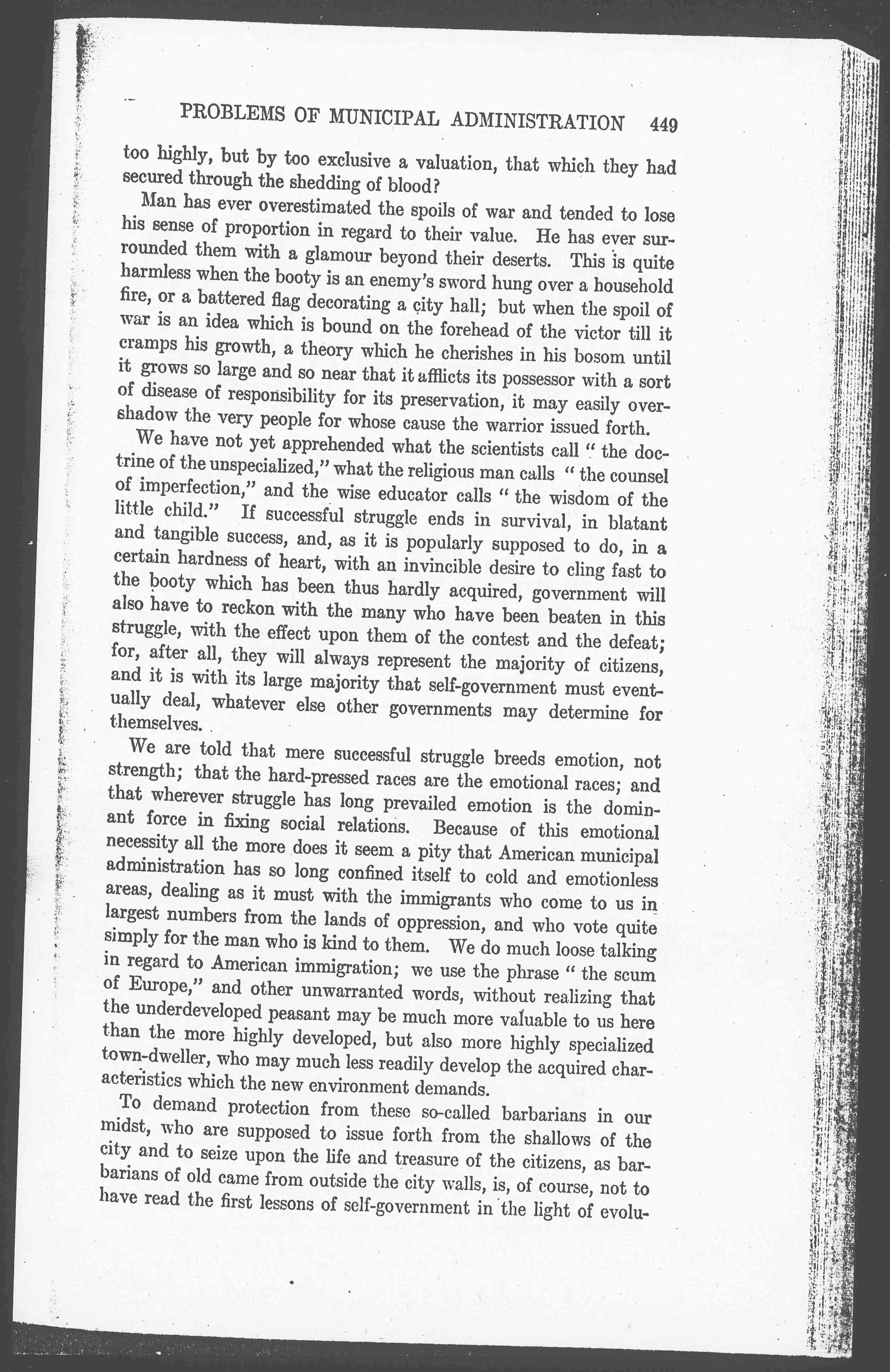 We are told that mere successful struggle breeds emotion, not strength; that the hard-pressed races are the emotional races; and that wherever struggle has long prevailed emotion is the dominant force in fixing social relations. Because of this emotional necessity all the more does it seem a pity that American municipal administration has so long confined itself to cold and emotionless areas, dealing as it must with the immigrants who come to us in largest numbers from the lands of oppression, and who vote quite simply for the man who is kind to them. We do much loose talking in regard to American immigration; we use the phrase "the scum of Europe," and other unwarranted words, without realizing that the underdeveloped peasant may be much more valuable to us here than the more highly developed, but also more highly specialized town-dweller, who may much less readily develop the acquired characteristics which the new environment demands.
