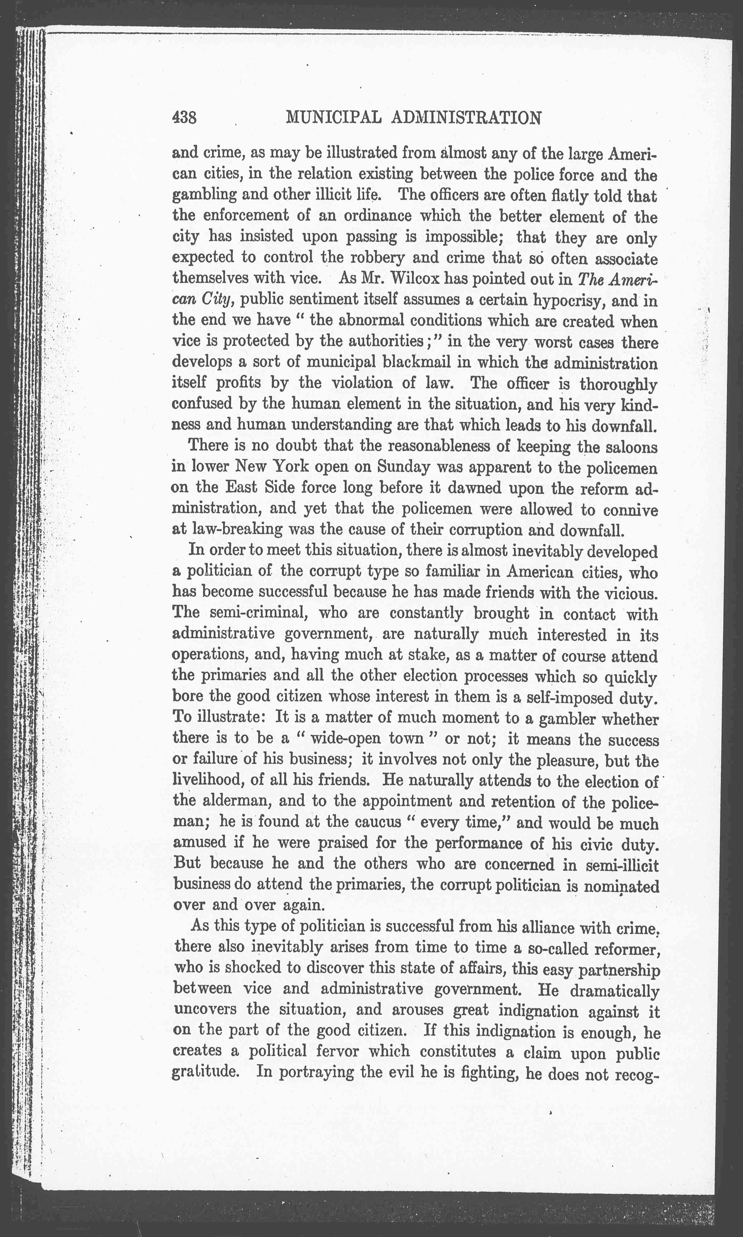 As this type of politician is successful from his alliance with crime, there also inevitably arises from time to time a so-called reformer, who is shocked to discover this state of affairs, this easy partnership between vice and administrative government. He dramatically uncovers the situation, and arouses great indignation against it on the part of the good citizen. If this indignation is enough, he creates a political fervor which constitutes a claim upon public gratitude. In portraying the evil he is fighting, he does not recognize [page 6], or at least does not make clear, all the human kindness upon which it has grown. In his speeches he inevitably offends a popular audience, who know that the political evil exists in all degrees and forms of human weakness, but who also know that these evils are by no means always hideous. They resent his overdrawn pictures of vice and of the life of the vicious; their sense of fair play and their deep-rooted desire for charity and justice are all outraged.