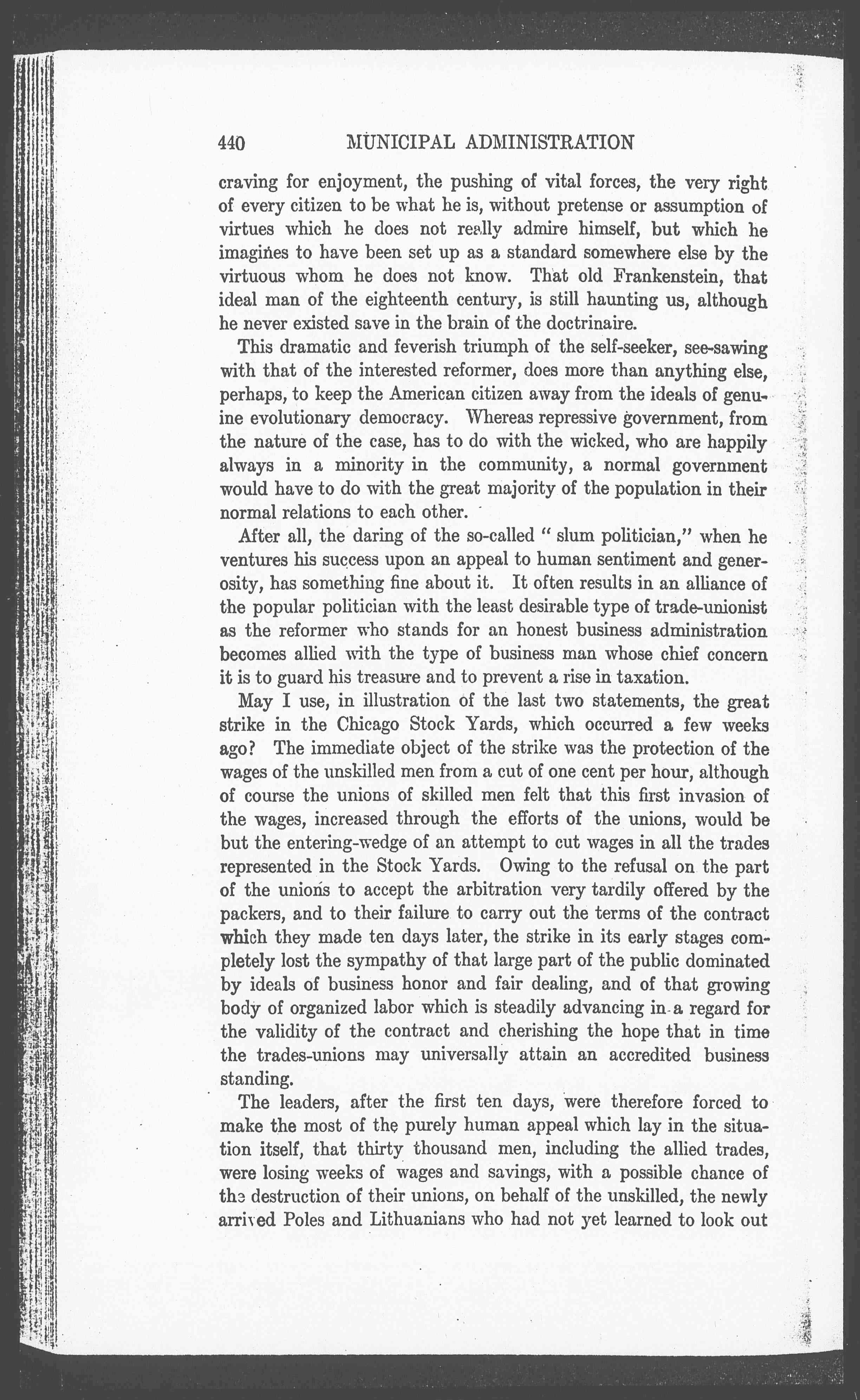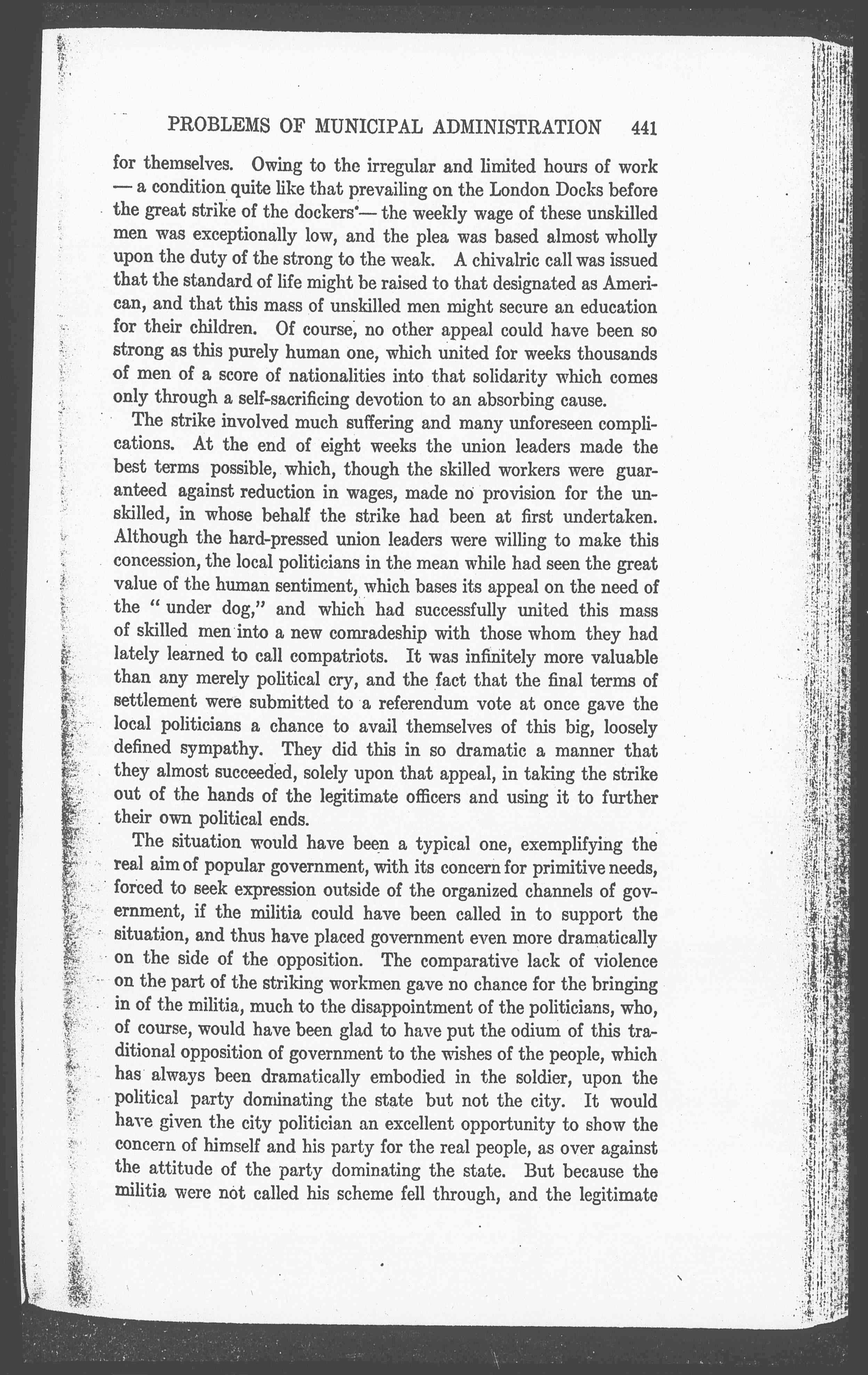 The situation would have been a typical one, exemplifying the real aim of popular government, with its concern for primitive needs, forced to seek expression outside of the organized channels of government, if the militia could have been glad to have put the odium of this traditional opposition of government to the wishes of the people, which has always been dramatically embodied in the soldier, upon the political party dominating the state but not the city. It would have given the city politician an excellent opportunity to show the concern of himself and his party for the real people, as over against the attitude of the party dominating the state. But because the militia were not called his scheme fell through, and the legitimate [page 9] strike leaders, who, although they passed through much tribulation because of the political interference, did not eventually lose control.
