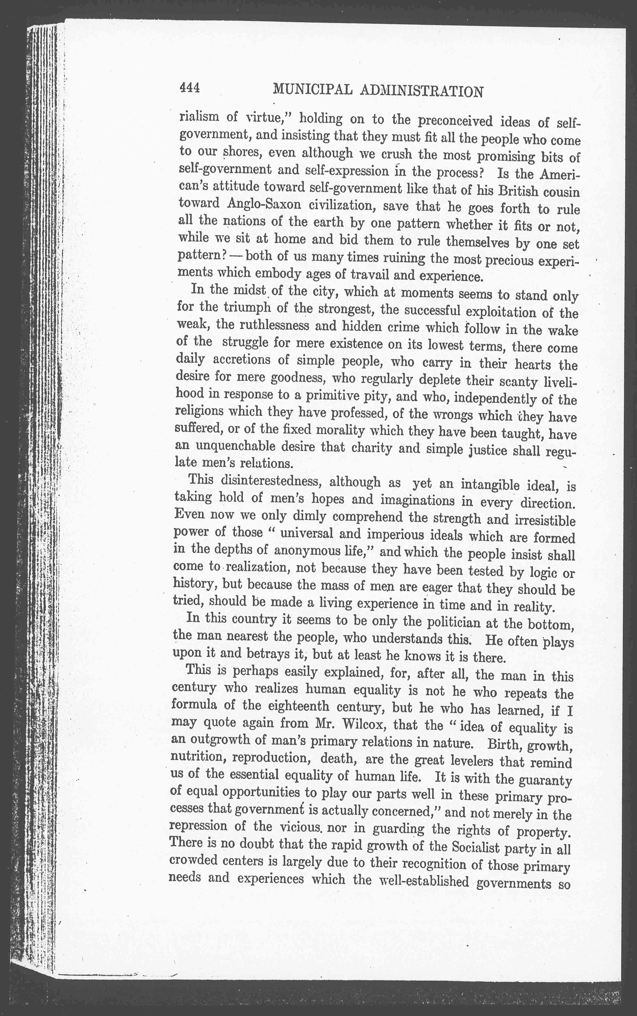 This is perhaps easily explained, for, after all, the man in this century who realizes human equality is not he who repeats the formula of the eighteenth century, but he who has learned, if I may quote again from Mr. Wilcox, that the "idea of equality is an outgrowth of man's primary relations in nature. Birth, growth, nutrition, reproduction, death, are the great levelers that remind us of the essential equality of human life. It is with the guarantee of equal opportunities to play our parts well in these primary processes that government is actually concerned," and not merely in the repression of the vicious, nor in guarding the rights of property. There is no doubt that the rapid growth of the Socialist party in all crowded centers is largely due to their recognition of those primary needs and experiences which the well-established governments so [page 12] stupidly ignore, and also to the fact that they are preaching industrial government to an industrial age which recognizes it as vital and adapted to its needs. All of that devotion, all of that speculative philosophy concerning the real issues of life could, of course, easily be turned into a passion for self-government and the development of the national life, if we were really democratic from the modern evolutionary standpoint, and did we but hold our town meetings upon topics that most concern us.