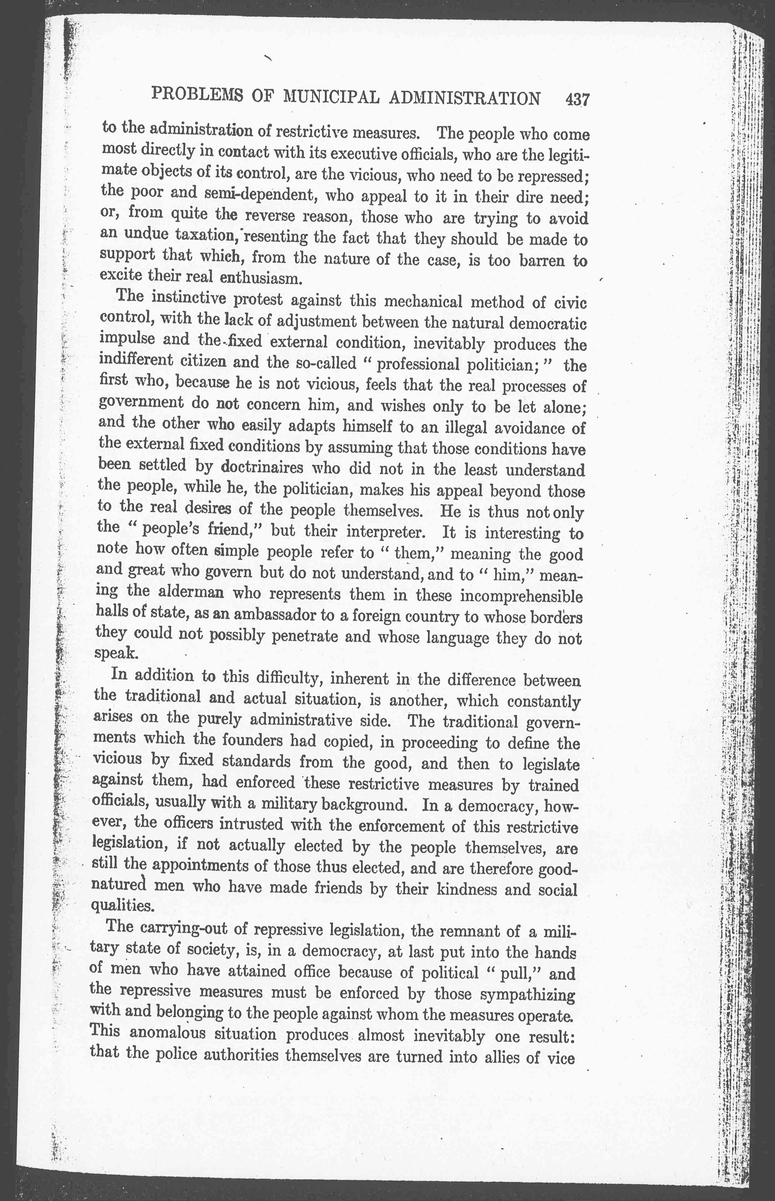 The instinctive protest against this mechanical method of civic control, with the lack of adjustment between the natural democratic impulse and the fixed external condition, inevitably produces the indifferent citizen and the so-called "professional politician;" the first who, because he is not vicious, feels that the real processes of government do not concern him, and wishes only to be let alone; and the other who easily adapts himself to an illegal avoidance of the external fixed conditions by assuming that those conditions have been settled by doctrinaires who did not in the least understand the people, while he, the politician, makes his appeal beyond those to the real desires of the people themselves. He is thus not only the "people's friend," but their interpreter. It is interesting to note how often simple people refer to "them," meaning the good and great who govern but do not understand, and to "him," meaning the alderman who represents them in these incomprehensible halls of state, as an ambassador to a foreign country to whose borders they could not possibly penetrate and whose language they do not speak.