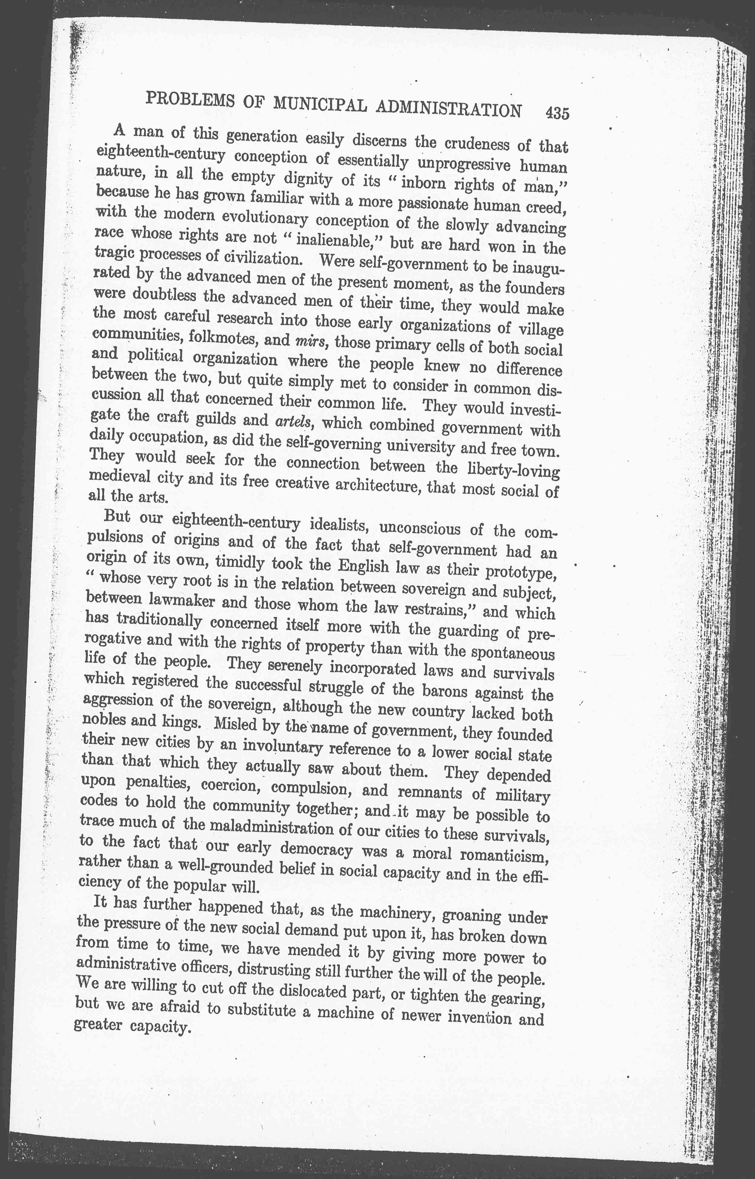A man of this generation easily discerns the crudeness of that eighteenth-century conception of essentially unprogressive human nature, in all the empty dignity of its "inborn rights of man," because he has grown familiar with a more passionate human creed, with the modern evolutionary conception of the slowly advancing race whose rights are not "inalienable," but are hard won in tragic processes of civilization. Were self-government to be inaugurated by the advanced men of the present moment, as the founders were doubtless the advanced men of their time, they would make the most careful research into those early organizations of village communities, folkmotes, and mirs, those primary cells of both social and political organization where the people knew no difference between the two, but quite simply met to consider in common discussion all that concerned their common life. They would investigate the craft guilds and artels, which combined government with daily occupation, as did the self-governing university and free town. They would seek for the connection between the liberty-loving medieval city and its free creative architecture, that most social of all the arts.