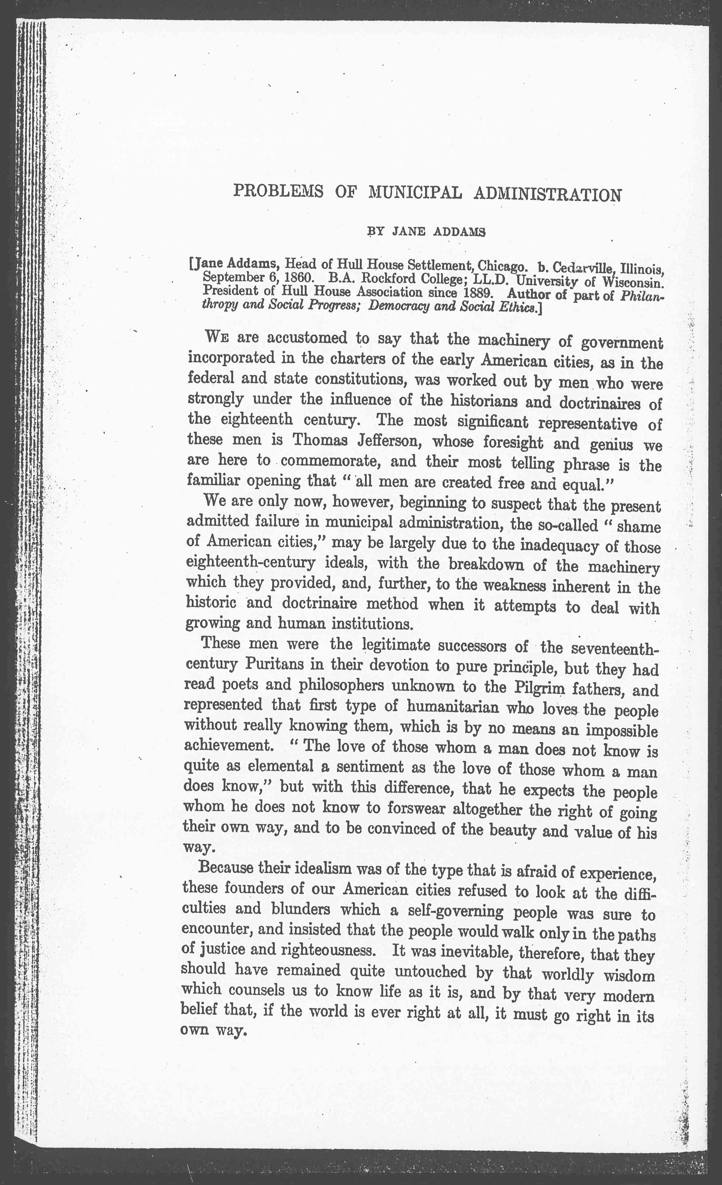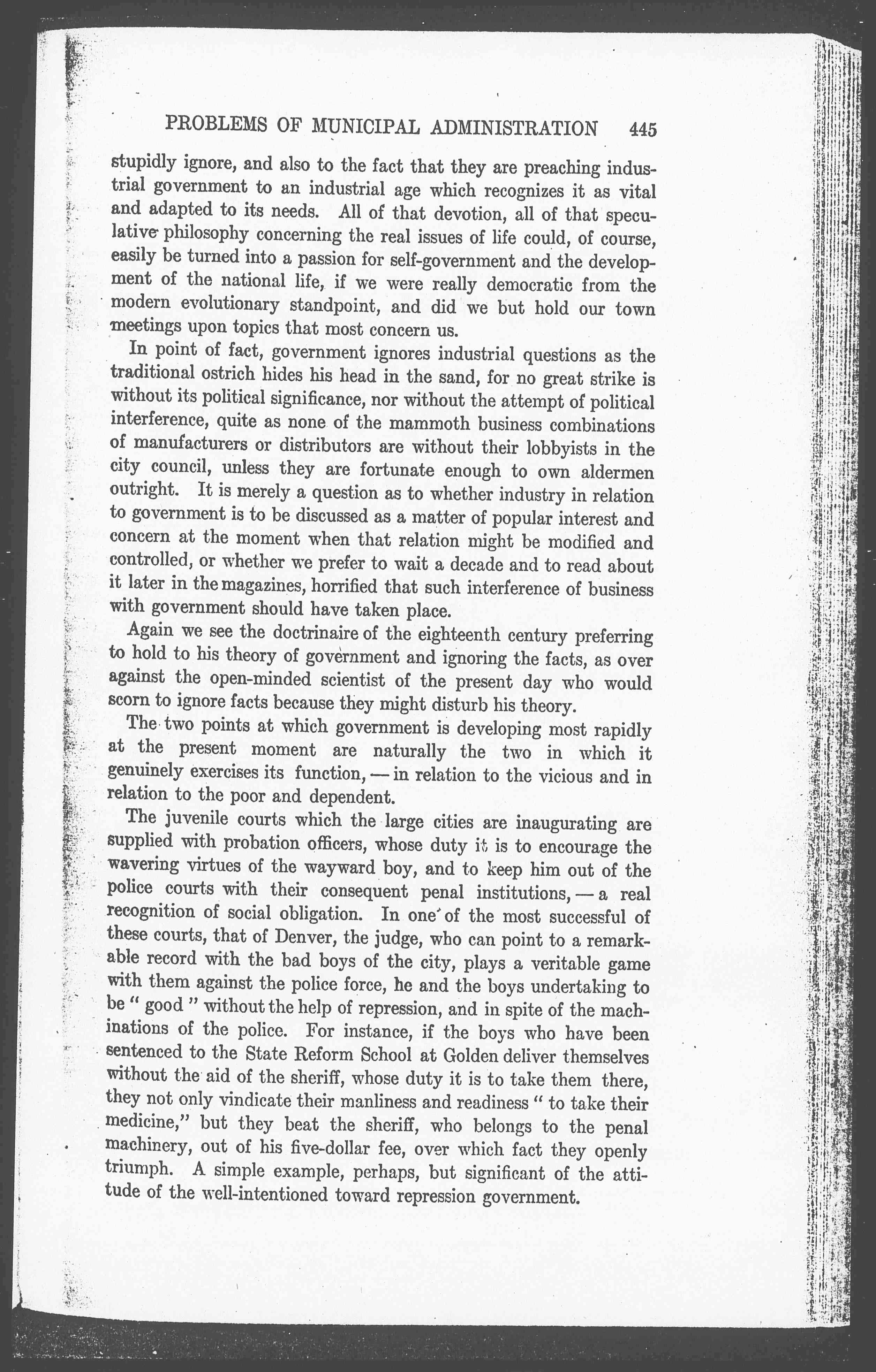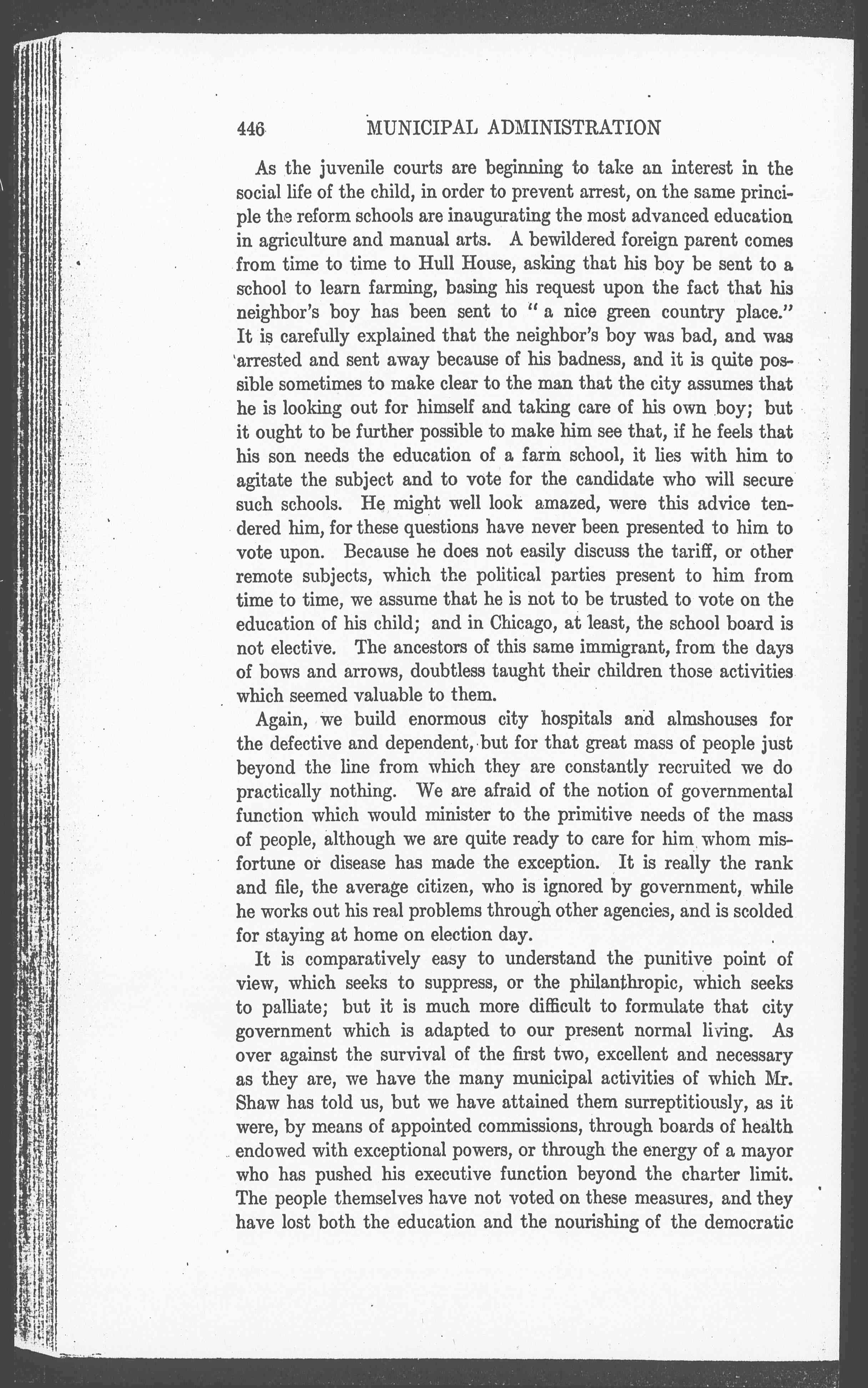 It is comparatively easy to understand the punitive point of view, which seeks to suppress, or the philanthropic, which seeks to palliate; but it is much more difficult to formulate that city government which is adapted to our present normal living. As over against the survival of the first two, excellent and necessary as they are, we have the many municipal activities of which Mr. Shaw has told us, but we have attained them surreptitiously, as it were, by means of appointed commissions, through boards of health endowed with exceptional powers, or through the energy of a mayor who has pushed his executive function beyond the charter limit. The people themselves have not voted on these measures, and they have lost both the education and the nourishing of the democratic [page 14] ideal, which their free discussion would have secured and to which they were more entitled than to the benefits themselves.