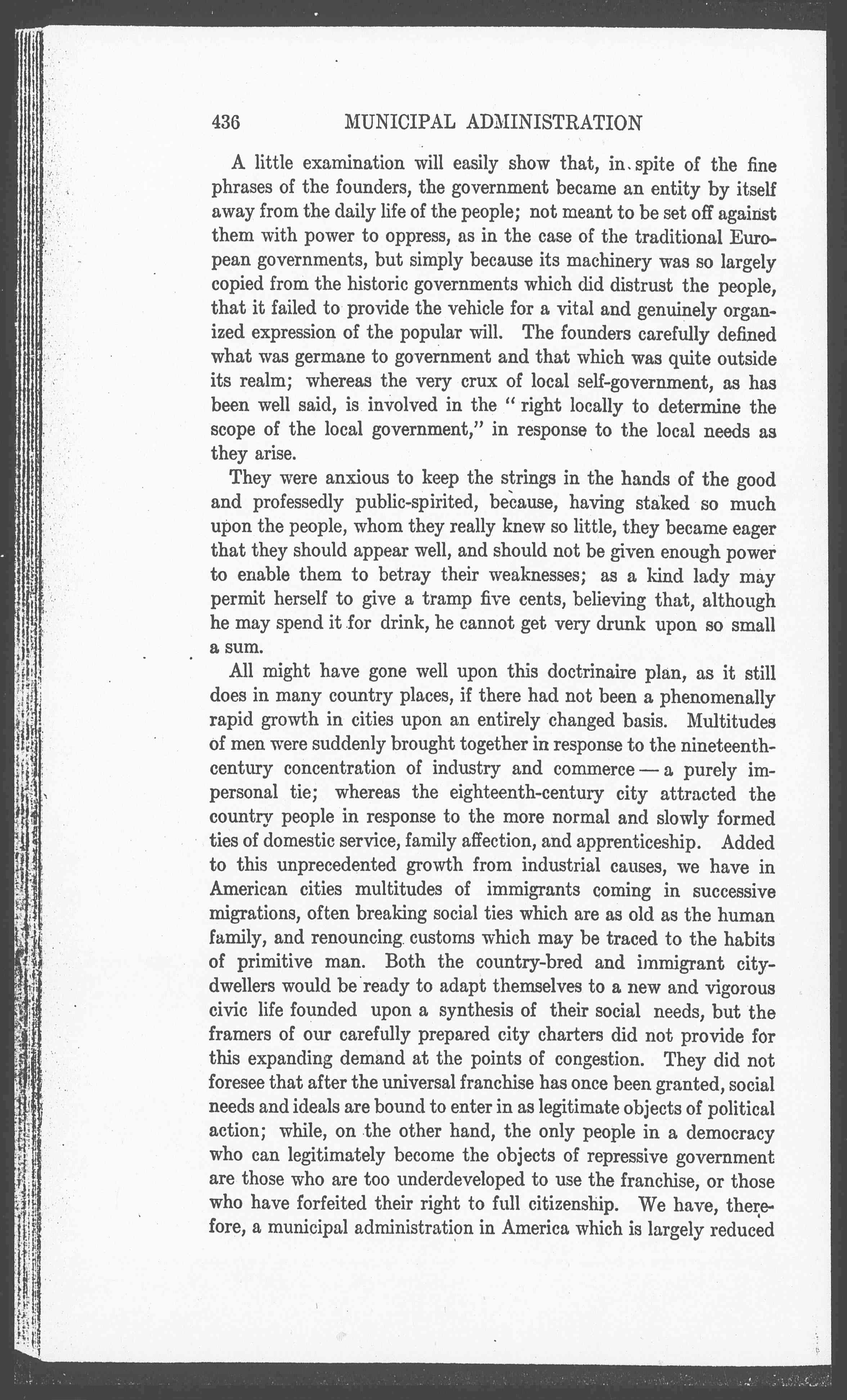 All might have gone well upon this doctrinaire plan, as it still does in many country places, if there had not been a phenomenally rapid growth in cities upon an entirely changed basis. Multitudes of men were suddenly brought together in response to the nineteenth-century concentration of industry and commerce--a purely impersonal tie; whereas the eighteenth-century city attracted the country people in response to the more normal and slowly formed ties of domestic service, family affection, and apprenticeship. Added to this unprecedented growth from industrial causes, we have in American cities multitudes of immigrants coming in successive migrations, often breaking social ties which are as old as the human family, and renouncing customs which may be traced to the habits of primitive man. Both the country-bred and immigrant city-dwellers would be ready to adapt themselves to a new and vigorous civic life founded upon a synthesis of their social needs, but the framers of our carefully prepared city charters did not provide for this expanding demand at the points of congestion. They did not foresee that after the universal franchise has once been granted, social needs and ideals are bound to enter in as legitimate objects of political action; while, on the other hand, the only people in a democracy who can legitimately become the objects of repressive government are those who are too underdeveloped to use the franchise, or those who have forfeited their right to full citizenship. We have, therefore, a municipal administration in America which is largely reduced [page 4] to the administration of restrictive measures. The people who come most directly in contact with its executive officials, who are the legitimate objects of its control, are the vicious, who need to be repressed; the poor and semi-dependent, who appeal to it in their dire need; or, from quite the reverse reason, those who are trying to avoid an undue taxation, resenting the fact that they should be made to support that which, from the nature of the case, is too barren to excite their real enthusiasm.