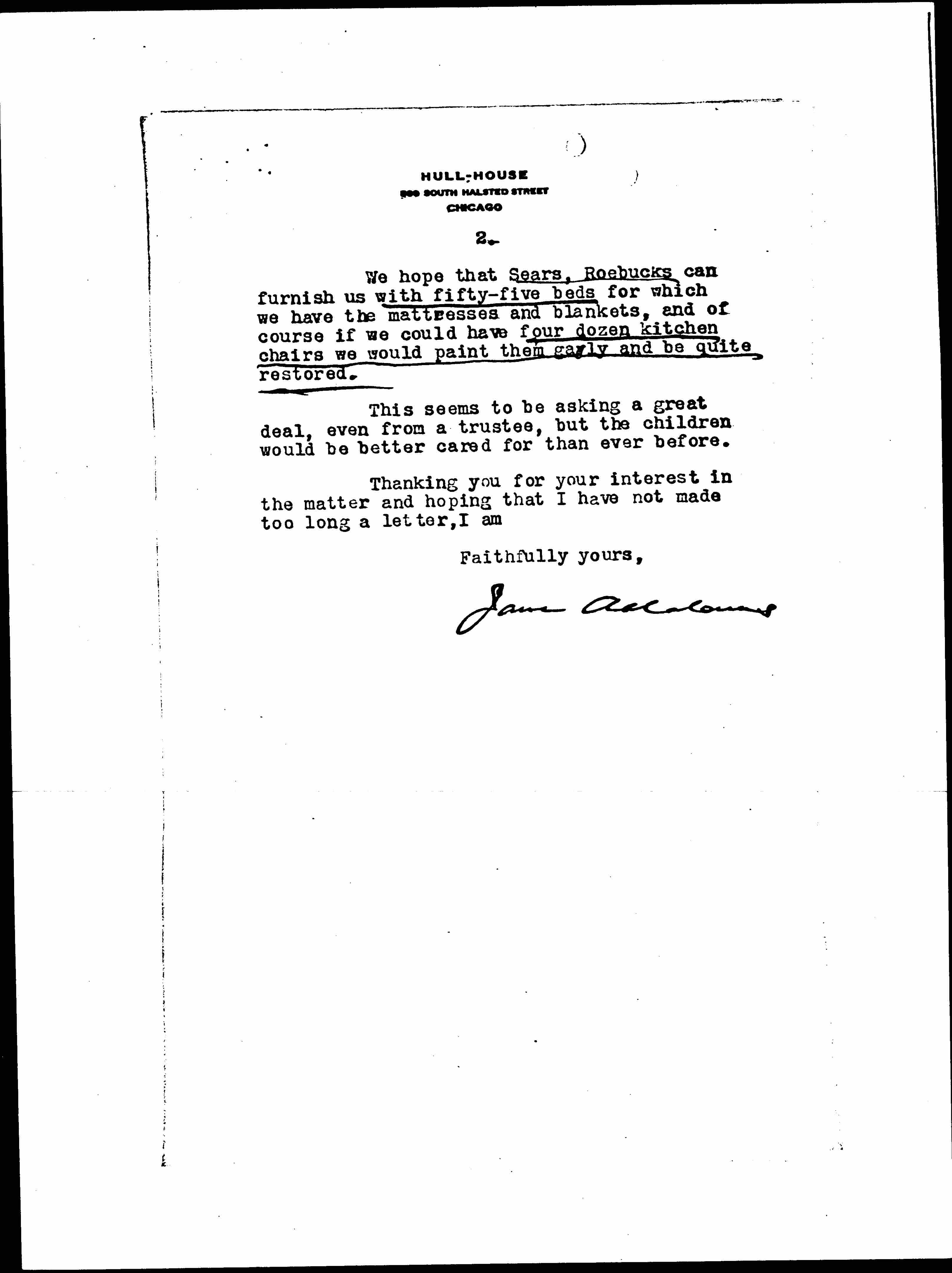 We hope that Sears, [Roebuck] can furnish us with fifty-five beds for which we have the mattresses and blankets, and of course if we could have four dozen kitchen chairs we would paint them gayly and be quite restored.