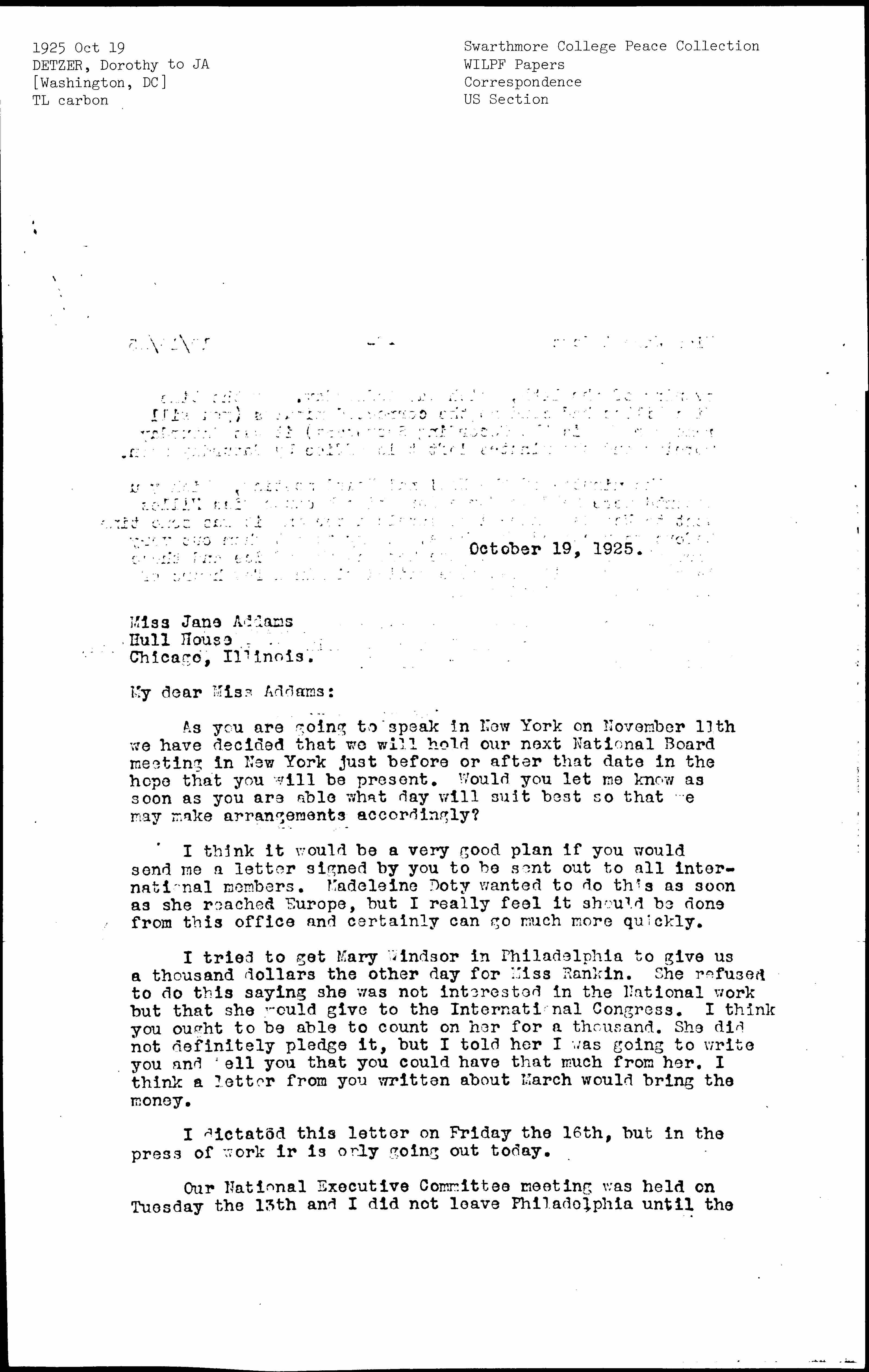 I tried to get Mary [Winsor] in Philadelphia to give us a thousand dollars the other day for Miss Rankin. She refused to do this saying she was not interested in the National work but that she would give to the International Congress. I think you ought to be able to count on her for a thousand. She did not definitely pledge it, but I told her I was going to write you and tell you that you could have that much from her. I think a letter from you written about March would bring the money.