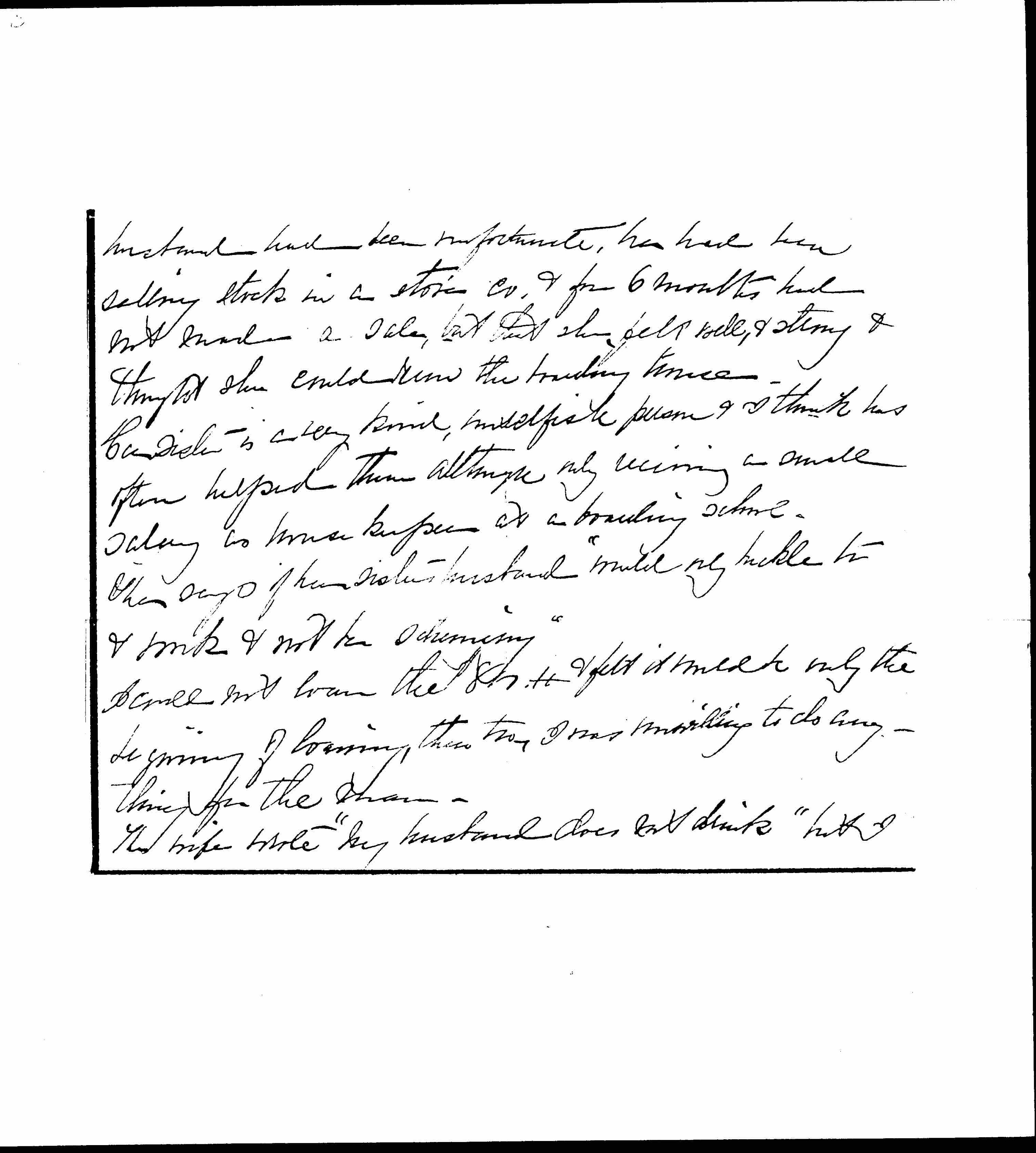 Last Oct. to my great surprise, she wrote me asking the loan of $800.xx to start a boarding house. She said her [page 3] husband had been unfortunate, he had been selling stock in a store co. & for 6 months had not made a sale, but that she fell well, & strong & thought she could run the boarding house.