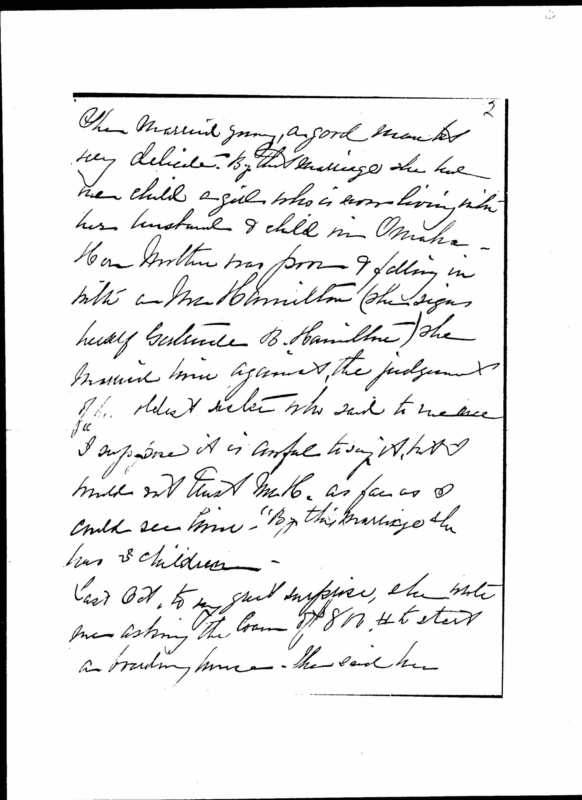 Will you help me out of a difficulty? There is at present a couple, with three children, living at 3714 Washington ave Chicago, or they were on Dec. 14th. The wife is a connection of mine. I have not seen her since she was a little girl, & I was young too. My impression of her at that time was that she was a very nervous excitable child & that her mother was a good deal trouble about her. Her father was a high liver & in the end squandered two fortunes. She was, you see, brought up in luxury. [page 2] She married young, a good man but very delicate. By that marriage she had [one] child a girl who is now living with her husband & child in Omaha. Her mother was poor & falling in with a Mr. Hamilton (she signs herself Gertrude B. Hamilton) she married him against the judgement of her oldest sister who said to me once "I suppose it is awful to say it, but I would not trust Mr H. as far as I could see him." By this marriage she has 3 children.