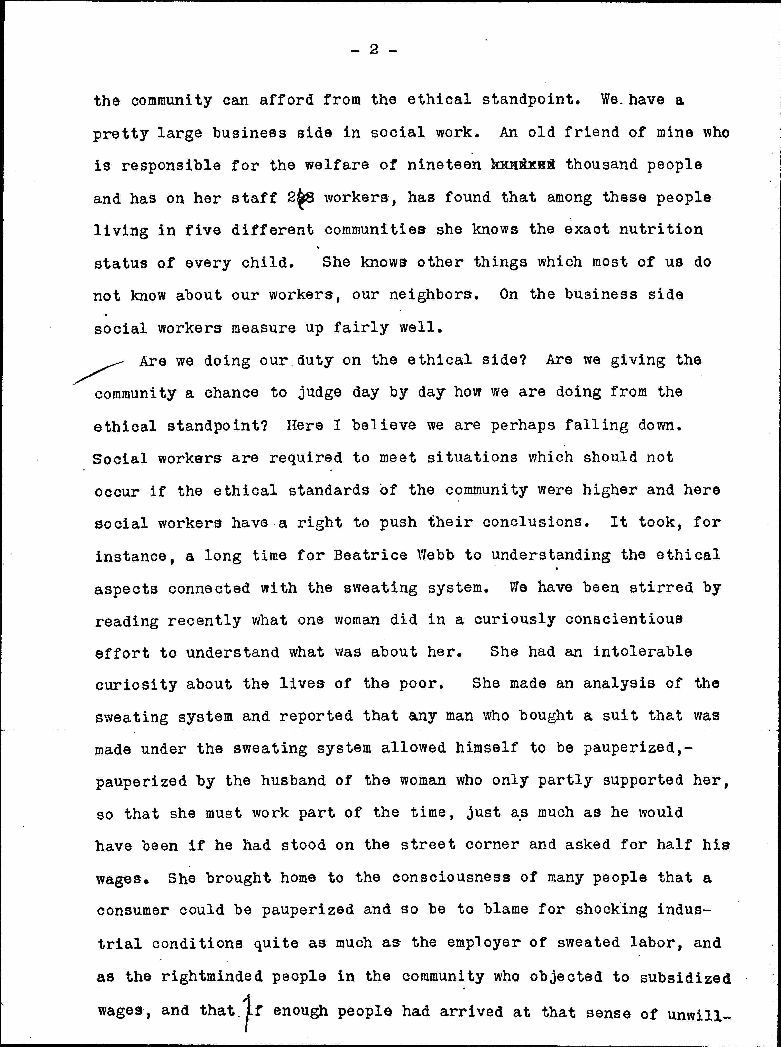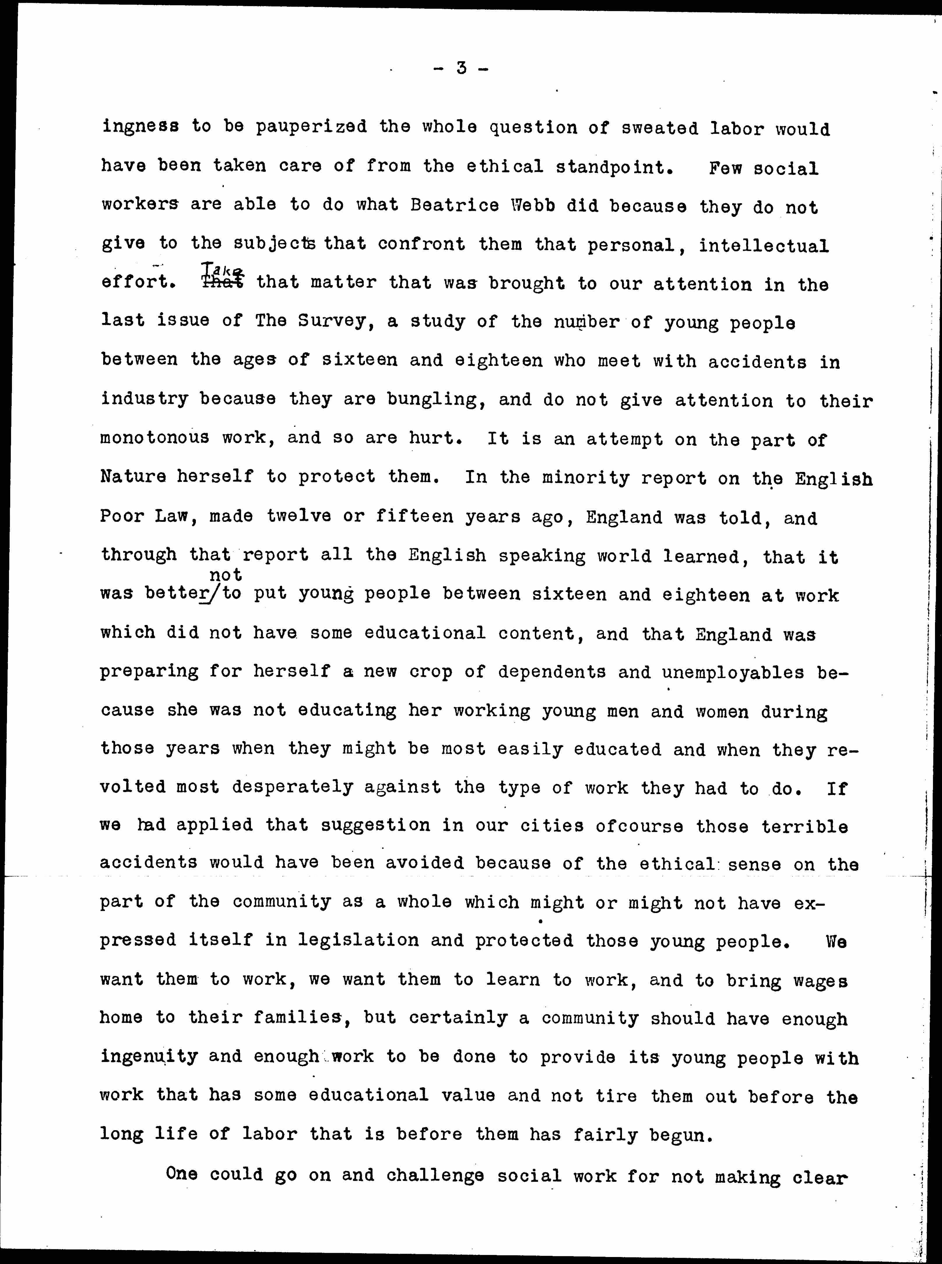 Are we doing our duty on the ethical side? Are we giving the community a chance to judge day by day how we are doing from the ethical standpoint? Here I believe we are perhaps falling down. Social workers are required to meet situations which should not occur if the ethical standards of the community were higher and here social workers have a right to push their conclusions. It took, for instance, a long time for Beatrice Webb to understanding the ethical aspects connected with the sweating system. We have been stirred by reading recently what one woman did in a curiously conscientious effort to understand what was about her. She had an intolerable curiosity about the lives of the poor. She made an analysis of the sweating system and reported that any man who bought a suit that was made under the sweating system allowed himself to be pauperized, -- pauperized by the husband of the woman who only partly supported her, so that she must work part of the time, just as much as he would have been if he had stood on the street corner and asked for half his wages. She brought home to the consciousness of many people that a consumer could be pauperized and so be to blame for shocking industrial conditions quite as much as the employer of sweated labor, and as the rightminded people in the community who objected to subsidized wages, and that if enough people had arrived at that sense of unwillingness [page 3] to be pauperized the whole question of sweated labor would have been taken care of from the ethical standpoint. Few social workers are able to do what Beatrice Webb did because they do not give to the subjects that confront them that personal, intellectual effort. That ↑Take↓ that matter that was brought to our attention in the last issue of The Survey, a study of the number of young people between the ages of sixteen and eighteen who meet with accidents in industry because they are bungling, and do not give attention to their monotonous work, and so are hurt. It is an attempt on the part of Nature herself to protect them. In the minority report on the English Poor Law, made twelve or fifteen years ago, England was told, and through that report all the English speaking world learned, that it was better ↑not↓ to put young people between sixteen and eighteen at work which did not have some educational content, and that England was preparing for herself a new crop of dependents and unemployables because she was not educating her working young men and women during those years when they might be most easily educated and when they revolted most desperately against the type of work they had to do. If we had applied that suggestion in our cities of course those terrible accidents would have been avoided because of the ethical sense on the part of the community as a whole which might or might not have expressed itself in legislation and protected those young people. We want them to work, we want them to learn to work, and to bring wages home to their families, but certainly a community should have enough ingenuity and enough work to be done to provide its young people with work that has some educational value and not tire them out before the long life of labor that is before them has fairly begun.