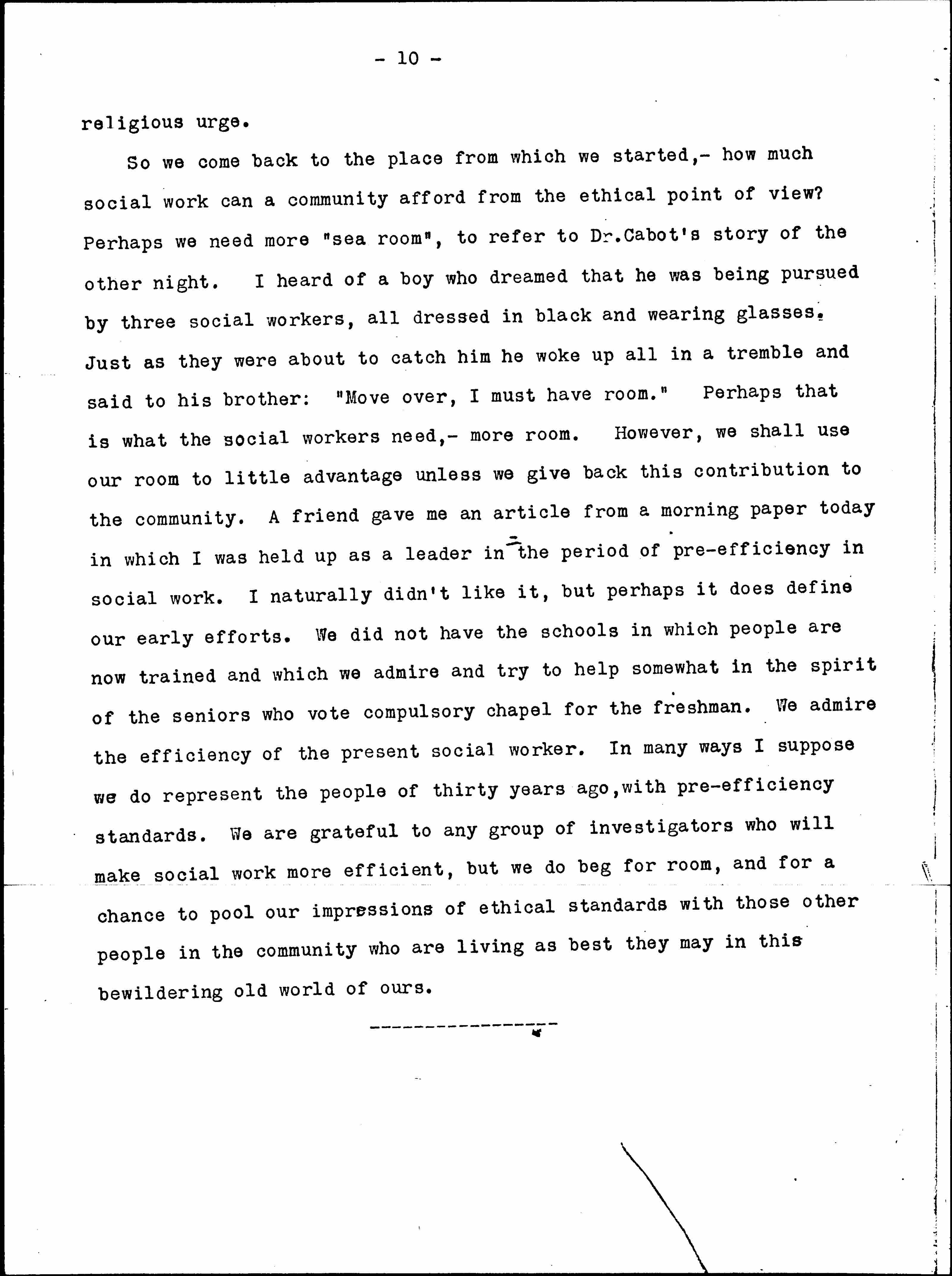 So we come back to the place from which we started, -- how much social work can a community afford from the ethical point of view? Perhaps we need more "sea room," to refer to Dr. Cabot's story of the other night. I heard of a boy who dreamed that he was being pursued by three social workers, all dressed in black and wearing glasses. Just as they were about to catch him he woke up all in a tremble and said to his brother: "Move over, I must have room." Perhaps that is what the social workers need, -- more room. However, we shall use our room to little advantage unless we give back this contribution to the community. A friend gave me an article from a morning paper today in which I was held up as the leader in the period of pre-efficiency in social work. I naturally didn't like it, but perhaps it does define our early efforts. We did not have the schools in which people are now trained and which we admire and try to help somewhat in the spirit of the seniors who vote compulsory chapel for the freshman. We admire the efficiency of the present social worker. In many ways I suppose we do represent the people of thirty years ago, with pre-efficiency standards. We are grateful to any group of investigators who will make social work more efficient, but we do beg for room, and for a chance to pool our impressions of ethical standards with those other people in the community who are living as best they may in this bewildering old world of ours.