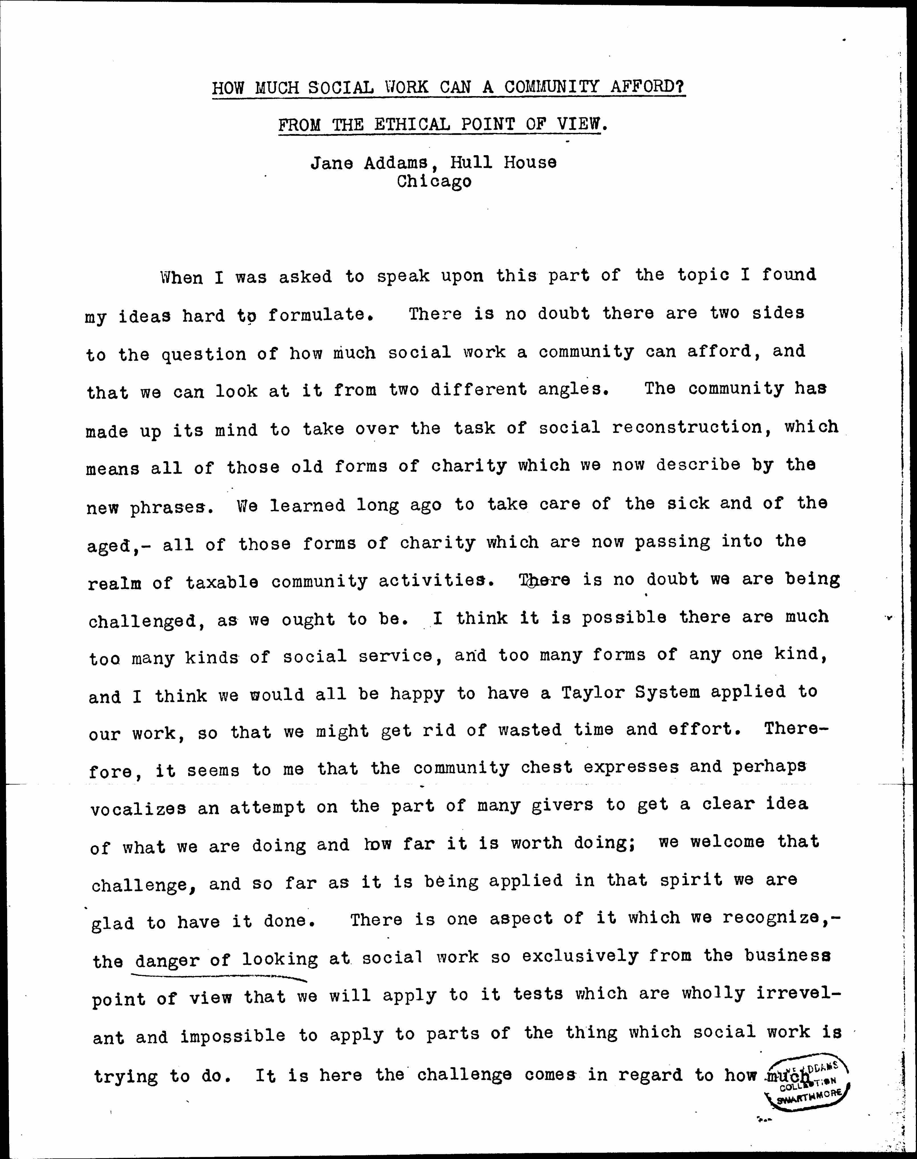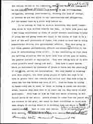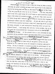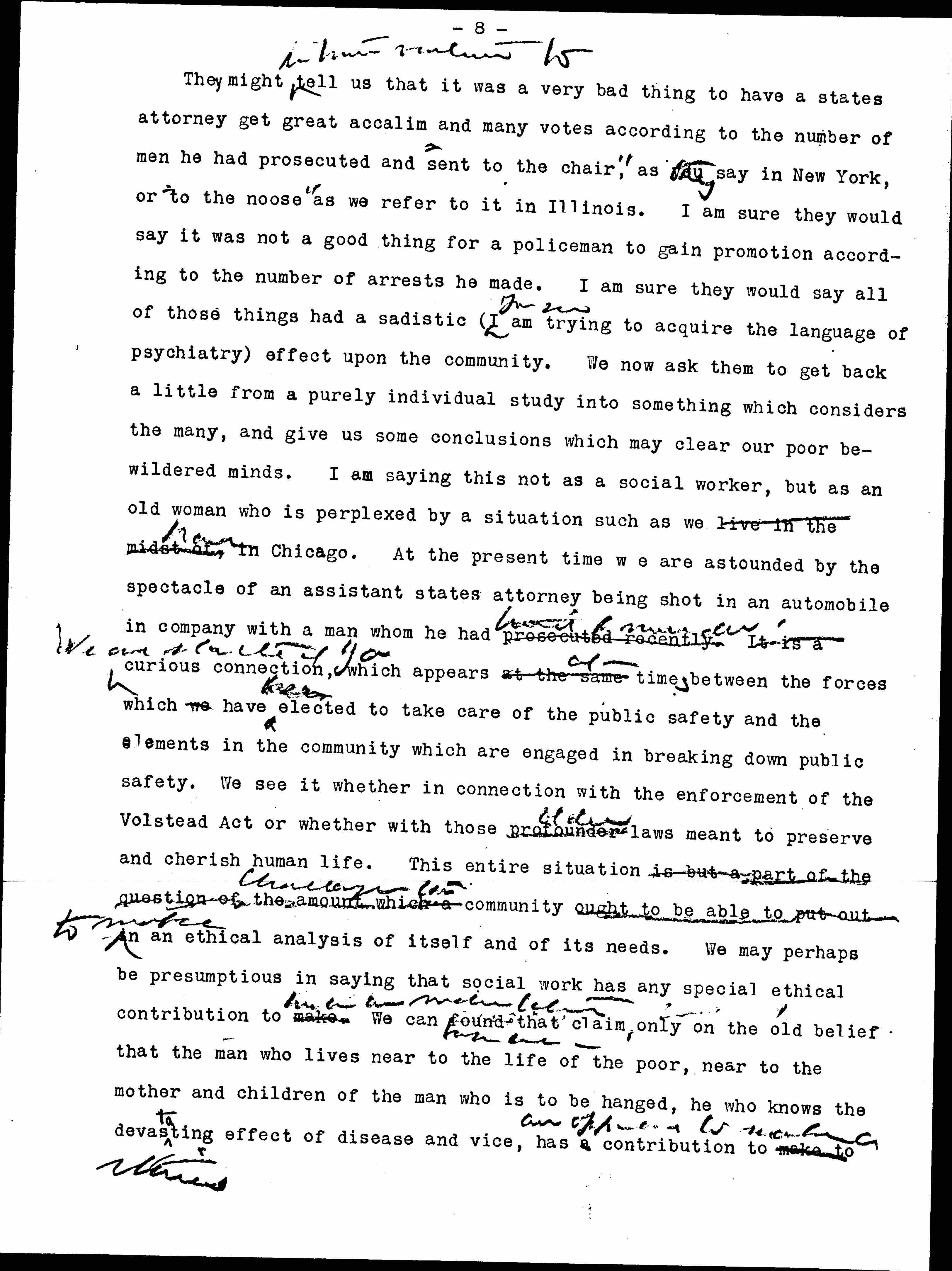 They might ↑in time venture to↓ tell us that it was a very bad thing to have a states attorney get great acclaim and many votes according to the number of men he had prosecuted and "sent to the chair," as you ↑they↓ say in New York, or "to the noose" as we refer to it in Illinois. I am sure they would say it was not a good thing for a policeman to gain promotion according to the number of arrests he made. I am sure they would say all of those things had a sadistic (↑you see↓ I am trying to acquire the language of psychiatry) effect upon the community. We now ask them to get back a little from a purely individual study into something which considers the many, and give us some conclusions which may clear our poor bewildered minds. I am saying this not as a social worker, but as an old woman who is perplexed by a situation such as we live in the midst of ↑have↓ in Chicago. At the present time we are astounded by the spectacle of an assistant states attorney being shot in an automobile in company with a man whom he had prosecuted recently ↑tried for murder↓. It is a ↑We are startled by a↓ curious connection, which at the same ↑at↓ times between the forces which we have ↑been↓ elected to take care of the public safety and the elements in the community which are engaged in breaking down public safety. We see it whether in connection with the enforcement of the Volstead Act or whether with those profounder ↑older↓ laws meant to preserve and cherish human life. This entire situation is but a part of the question of the amount which a ↑challenges the↓ community ought to be able to put out ↑to make↓ in an ethical analysis of itself and of its needs. We may perhaps be presumptuous in saying that social work has any special ethical contribution to make ↑such an [undertaking]↓. We can found that ↑base that↓ claim only on the old belief that the man who lives near to the life of the poor, near to the mother and children of the man who is to be hanged, he who knows the devastating effect of disease and vice, has a ↑an opportunity to make a↓ contribution to make to ↑ethics↓ [page 9] the ethical values of the community. and it may be ↑We will certainly↓ we are losing out on the ethical side of social work because ↑then [illegible]↓ if we are [shirk] that obligation, shirking intellectually, shirking for lack of courage, or because we are not alive to our opportunities and obligations. For the moment that is a plain duty before us.
